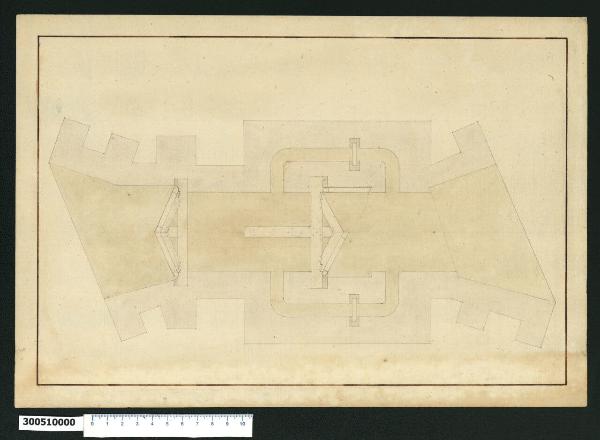 - NOTIZIE STORICO CRITICHE Nell'"Indice" del tomo nel quale era rilegato il disegno viene definito: "Pianta (...) / d'una cataratta". \nSi tratta di uno studio relativo a una chiusa (o cataratta), attribuito da Hellmut Lorenz a Domenico Martinelli e rappresenta la pianta che illustra il funzionamento del meccanismo. Il disegno è collegato ad altri tre relativi allo stesso soggetto presenti nella Collezione Sardini Martinelli: la rappresentazione delle due fronti alle estremità della chiusa (Milano, Collezione Sardini Martinelli inv. 3,2bis), la pianta della struttura di base (ibidem inv. 3,3) e la sezione longitudinale (ibidem inv. 3,5). \nSecondo le indicazioni fornite dalla scala grafica inserita in uno dei disegni citati (inv. 3,3), dovrebbe appartenere alla serie di studi di macchine eseguiti da Martinelli in occasione della sua permanenza in territorio renano (Germania e Olanda) tra il 1694 e il 1698.\nSi potrebbe trattare quindi della riproduzione di un manufatto da lui visto in uno di questi paesi, da conservare come esempio o da riproporre come modello a qualche committente. Non è possibile risalire a una collocazione più precisa sul territorio. \nIl funzionamento del sistema è rilevabile confrontando il disegno con la sezione: i portelloni, chiusi con un'angolatura che attenua la spinta della corrente, si aprono per il passaggio delle barche, mentre ai lati all'interno della muratura delle bocche di deflusso consentono il regolamento del livello dell'acqua.