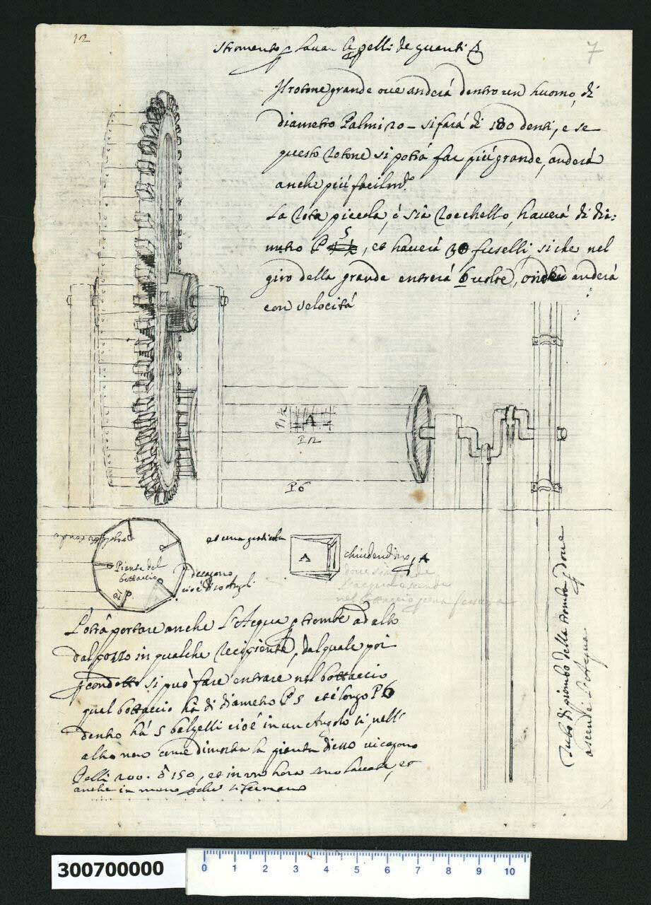 - NOTIZIE STORICO CRITICHE Nell'"Indice" del tomo nel quale era rilegato il disegno viene definito: "altra machina del medesi- / mo per la concia delle pelli". \nIl disegno prospettico mostra il funzionamento di una macchina che, secondo le indicazioni dell'autore, può essere utilizzata per lavare le pelli dei guanti. La rappresentazione grafica è accompagnata dalla relativa spiegazione e da alcuni dettagli costruttivi riportati a parte. \nL'attribuzione di Hellmut Lorenz a Domenico Martinelli è suffragata dall'esame della grafia e dal confronto calligrafico. Non si hanno elementi fondati per una datazione certa. Il disegno potrebbe far parte della serie di studi di macchine che Martinelli affrontò nel corso del suo soggiorno in Olanda, tra il 1695 e il 1698, ma anche appartenere al periodo successivo del rientro a Roma (1699 -1700), in quanto l'iscrizione sul verso riporta riferimenti riguardanti questa città. \nIl macchinario è costituito da una grande ruota dentata imperniata saldamente a due travi infisse nel terreno che, spinta da un uomo posto al suo interno, fa girare una ruota dentata più piccola o "rocchello" fissata a un rullo o "bottaccio" in legno che presenta uno sportellino attraverso il quale sono immesse le pelli. Il movimento del rullo potrà anche favorire l'ascesa dell'acqua da un pozzo verso un altro recipiente e da qui all'interno del rullo stesso, attraverso un condotto, per il lavaggio delle pelli. Sul verso del disegno è riportata una iscrizione riguardante il rapporto tra rocchello e ruota o rosone principale, in relazione alla velocità impressa alla macchina.