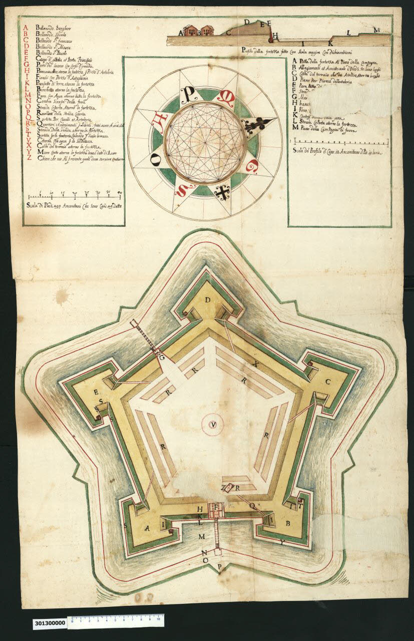 - NOTIZIE STORICO CRITICHE Nell'"Indice" del tomo nel quale era rilegato il disegno viene definito: "Fortezza in Ancona" e così pure da un'iscrizione a grafite sul verso. \nTuttavia da un confronto con le fortificazioni della città risalenti al XVI secolo, realizzate nei tratti essenziali a partire dal 1532 in parte dal fiorentino Antonio Sangallo il giovane su incarico di papa Clemente VII, con il pretesto di difendere la città dai Turchi ma in realtà per sottometterla allo Stato Pontificio e in parte dall'architetto urbinate Francesco Paciotto (tra 1550 e 1575), che ne curò la messa a punto e le completò con il progetto definitivo del grande Campo Trincerato, si nota che la conformazione è del tutto differente. \nDalla Relazione finale del 1588 dell'anconetano Giacomo Fontana si individua infatti la configurazione della rocca alla fine del XVI secolo e ancora oggi così visibile: "un corpo poligonale sul quale si proiettavano agli esterni sette bastioni a varie quote e di varia forma": la Tenaglia, la Punta (poi Barberino), il Giardino, il Cavaliere a basso (poi Gregoriano), la Campana, la Forbice, la Guardia. Il disegno invece propone una "Cittadella" di forma regolare pentagonale, in cui si possono intravedere le caratteristiche tipiche di altre opere di fortificazione realizzate dallo stesso Francesco Paciotto, divenute modello esemplare proprio verso la seconda metà del XVI secolo: le cittadelle di Anversa (Fiandre), di Torino e di Parma. \nLa scala metrica impressa sul disegno, in Piedi Anconetani, potrebbe confermare l'attribuzione del soggetto, ma si potrebbe trattare anche di un progetto in territorio marchigiano mai realizzato, eseguito dallo stesso Paciotto o da qualche seguace delle sue teorie di fortificazione. \nIl disegno riporta nella parte superiore del foglio una grande ed elaborata rosa dei venti, in cui il Nord è rappresentato da un segno simile a un giglio, di cui si è riscontrata la presenza in una carta nautica del XVI secolo. Intorno al cerchio che racchiude la rosa è tracciata una marginatura a forma di C rivolta verso il basso, che comprende a sinistra la legenda e la scala grafica del disegno principale, nella parte alta il profilo della fortezza e sulla destra le relative legenda (in parte purtroppo cancellata da una abrasione del foglio) e scala grafica. \nDalle legende si evincono gli elementi principali della cittadella: i cinque baluardi, il corpo di guardia o porta principale, la Porta del Soccorso con relativo corpo di guardia, il camminamento interno piano intorno alle mura e i fianchi dei baluardi rientranti dove era posta l'artiglieria, una corte interna circondata dagli alloggi dei soldati disposti lungo i lati del pentagono, la chiesa e la cisterna centrale per l'acqua. All'esterno, oltre la scarpata di terra intorno alla fortezza, la fossa con l'acqua, la controscarpa e la cosiddetta "strada coperta" con rivellini oltre la quale più in alto si estende il piano della campagna. \nDa rilevare è anche la qualità delle iscrizioni che riportano alcuni errori nella trascrizione di parole.