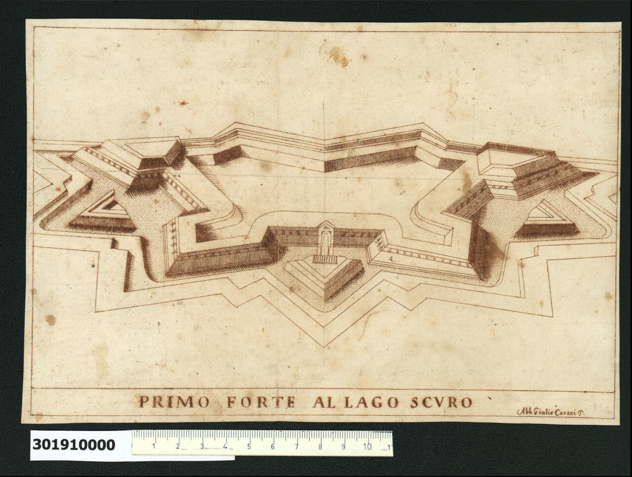 - NOTIZIE STORICO CRITICHE Nell'"Indice" del tomo nel quale il marchese Giacomo Sardini lo aveva rilegato, il disegno viene definito: "Fortezza di Lago Scuro". La provenienza ferrarese dell'autore, l'abate e storiografo Giulio Canani che firma il foglio, ha aiutato ad identificare il sito nella località oggi denominata Pontelagoscuro. Il borgo era situato sulla sponda destra del Po, in una zona strategica per la navigazione del fiume, soprattutto per i transiti tra i territori soggetti al papa e quelli soggetti a Venezia. Come riportano le cronache (Le cronache di Pontelagoscuro di Antonio Dolcetti, 1796-1802, a c. di R. Balzani, Bologna 1993, pp. 15-16), durante la guerra del 1641 i ferraresi costruirono "due forti, uno qui al Ponte, l'altro alla parte opposta del fiume". Durante il conflitto le costruzioni furono seriamente danneggiate e poi completamente demolite nel 1645 in ossequio alle convenzioni della pace firmata in quell'anno. Sul foglio è raffigurata una fortificazione dal profilo non regolare che anteriormente presenta quattro bastioni intervallati da tre difese, mentre sul lato opposto si snoda una cortina articolata. Si tratta di una veduta a volo d'uccello, secondo un metodo usuale nelle pubblicazioni sull'architettura militare dell'epoca; forse il disegnatore volle fissare il ricordo delle fortificazioni prima della loro definitiva sparizione. Il legame con la storia del territorio ferrarese induce ad ipotizzare che il foglio sia giunto nelle carte di Domenico Martinelli insieme agli altri disegni raccolti dal ferrarese Agostino Martinelli presenti nella Collezione in esame (Dallaj, 2006).