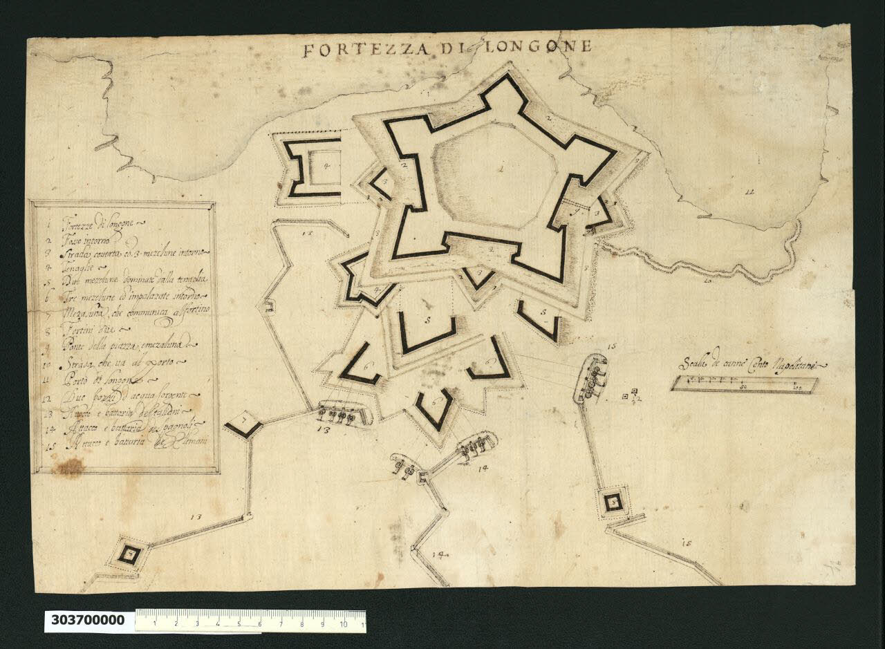 - NOTIZIE STORICO CRITICHE Nell'"Indice" del tomo nel quale era rilegato il disegno viene definito: "Fortezza di Longone".\nLa fortezza di Longone fu fondata nel 1603, da parte del vicerè di Napoli Giovanni Alfonso Pimentel de Herrera, conte di Benevento. In suo onore il forte ha assunto anche i nomi di Pimentel e Beneventano, ma è noto anche come forte San Giacomo, per l'omonima chiesa costruita al suo interno. I lavori furono affidati a don Garcia de Toledo, che si ispirò alla cittadella d'Anversa. \nNel 1646 il cardinale Mazzarino riuscì ad espugnare il forte, ma fu subito riconquistato nel 1650 dagli spagnoli di don Giovanni d'Austria, figlio di Filippo IV, dopo un lungo assedio (un disegno relativo a questo evento è conservato presso la Bibliothèque nationale de France a Parigi, inv. P53367).\nNel 1708 la fortezza si trovò a fare da teatro di battaglia nella guerra di successione spagnola (1701-14). Questa volta la guarnigione dovette vedersela con l'esercito della Grande Alleanza (Austria, Inghilterra e tedeschi del Sacro Romano Impero), ma grazie all' appoggio dei francesi, questa volta alleati degli iberici, l'assedio fu spezzato.\nNel 1759 vi fu la separazione formale tra il regno di Napoli e Madrid. I presidi spagnoli in Toscana, compreso quindi Longone, furono assegnati al nuovo stato borbonico. I lavori di potenziamento al forte sono testimoniati dal granduca di Toscana Pietro Leopoldo, qui in visita nel 1769.\nNel 1799 le truppe napoleoniche occuparono l'Elba, ma Longone oppose una resistenza vincente. Dopo la pace di Luneville però in forza di alcuni trattati l'isola passò comunque alla Francia. Con l'Ottocento, quando l'Elba passò interamente al granducato di Toscana, si concluse l'importanza militare del forte: le nuove tecnologie belliche e una concezione moderna della difesa resero obsolete queste strutture. Con il nuovo regno d'Italia Longone diverrà un penitenziario civile e nel 1947 i longonesi chiesero di cambiare il nome del loro paese in un più pacifico Porto Azzurro. \nIl disegno raffigura la fortezza di San Giacomo di Longone rappresentata nel corso della battaglia del 1708 relativa alla Guerra di Successione spagnola, essendo indicate le postazioni delle batterie di Italiani, di Spagnoli e di Alemanni disposte in direzione del forte. \nIl forte ha la forma di un pentagono irregolare, con tre lati che danno sul mare, sopra una ripida scogliera. Gli elementi che lo compongono sono semplici fronti tanagliati a scarpa, rinforzati lungo il lato nord-ovest verso terra oltre che da un fossato scavato nella viva roccia, da lunette, cavalieri e opere a corona. In questo versante infatti si erano resi necessari contrafforti esterni, bassi e non armati, ma in grado di resistere a un attacco.\nNon è possibile stabilire l'autore del disegno. Si segnala tuttavia la presenza di disegni relativi alla Fortezza di Longone e in particolare un altro disegno inerente la battaglia qui rappresentata, all'interno del Archivio Taverna conservato presso l'Archivio di Stato di Milano.