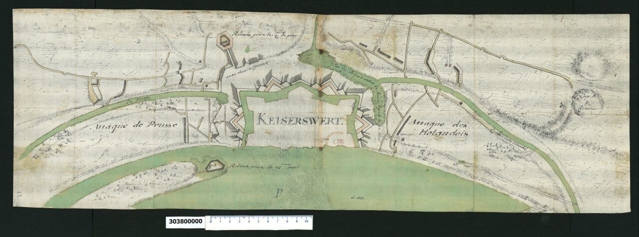 - NOTIZIE STORICO CRITICHE Nell'"Indice" del tomo nel quale era rilegato il disegno viene definito: "Fortezza di Kasserverte e suo / attacco". L'assedio di Kaiserswerth si svolse tra il 18 aprile e il 15 giugno 1702, nell'ambito della guerra di Successione Spagnola (1701-1714), che vide schierati da un lato il Regno di Francia, la Corona di Castiglia e l'Elettorato di Baviera, contro la Grande Alleanza (Regno di Gran Bretagna, le Province Unite, il Sacro Romano Impero, il Ducato di Savoia, il Regno di Portogallo e il Regno di Danimarca), per ostacolare la successione di Filippo d'Angiò, nipote del re di Francia Luigi XIV, a Carlo II.\nLa guerra si concluse con la pace di Utrecht del 1713, sottoscritta dall'Austria nel 1714 a Rastadt, con il riconoscimento di Filippo V re di Spagna, che dovette però separare la sua corona da quella di Francia. I due trattati sancirono anche molti cambiamenti nel rapporto di forze tra le maggiori potenze europee e mondiali.\nIl disegno rappresenta la città fortificata di Kaiserswerth, sulle rive del Reno, fronteggiata dai due schieramenti contrapposti: a sinistra l'armata prussiana e a destra quella olandese, con le rispettive linee di trincea e di attacco e l'indicazione delle date di resa degli avamposti. La città cadde nelle mani della Grande Alleanza dopo una strenua difesa. Non è stato possibile stabilire l'autore del disegno, forse appartenente all'ambito francese secondo la lingua delle iscrizioni.