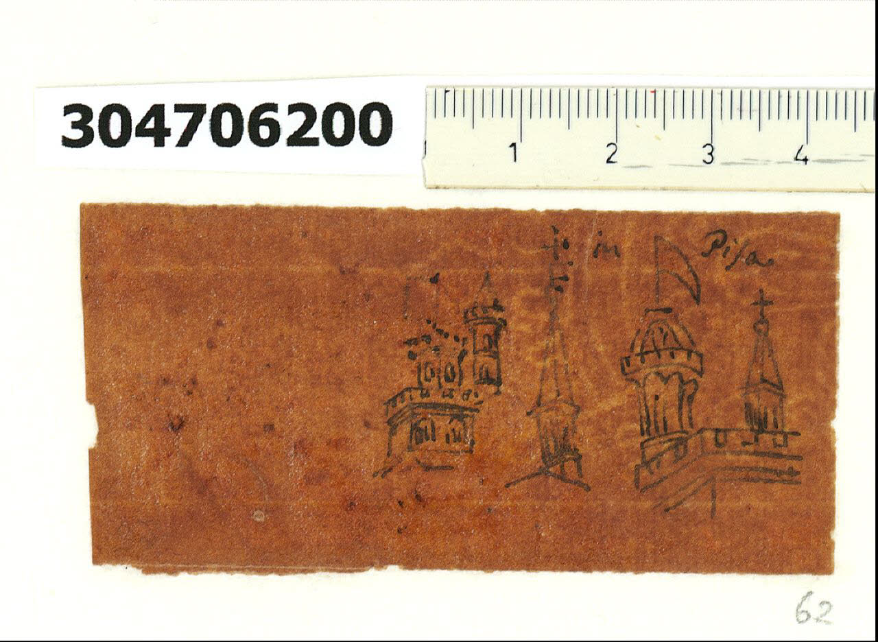 - NOTIZIE STORICO CRITICHE Nell' "Indice" del tomo nel quale il marchese Giacomo Sardini lo aveva rilegato, il disegno viene definito: "Sieguono alcune elucidazioni ricavate dalla Storia Originale di Gio Sercambj nell'Archivio Segreto ... Estremita superiore di fabbriche in Pisa".\nLa grafia delle iscrizioni su questo gruppo di disegni, di cui fa parte quello in esame, è riconducibile alla mano di Sardini, che pertanto si può ritenere l'esecutore dei lucidi. Il supporto, reso trasparente per impregnazione con resina, venne adattato all'esigenza del ricalco su esigue superfici suddividendolo in quattordici piccoli rettangoli. Il foglio in esame presenta porzione di filigrana complementare a quella del foglio con inventario 3,47bis f. A copiatura ultimata, questi furono incollati in bell'ordine su due carte inserite nella legatura del tomo. L'occasione di procurarsi riproduzioni dal codice tardo trecentesco con le Croniche di Sercambi si dischiuse a Sardini quando ottenne un permesso speciale per accedere alla Tarpea (l'Archivio segreto della Repubblica, oggi in Archivio di Stato), che custodiva quei preziosi manoscritti. Intento a raccogliere appunti dai documenti antichi per arricchire i suoi contributi dedicati alla storia artistica locale, il marchese non esitò a copiare alcune illustrazioni del manoscritto, oggetto di studio anche da parte di altri suoi contemporanei. Catturarono la sua attenzione soprattutto i centri fortificati dei dintorni di Lucca fino a Pisa, ma anche particolari di costume. Il copista preferì soffermarsi solo su dettagli dei riquadri figurati e, nei vari lucidi, si possono trovare brani tratti da una sola o da più vignette (come nel caso in esame riconducibile al capitolo DCVIII e ad altro non identificato del manoscritto).