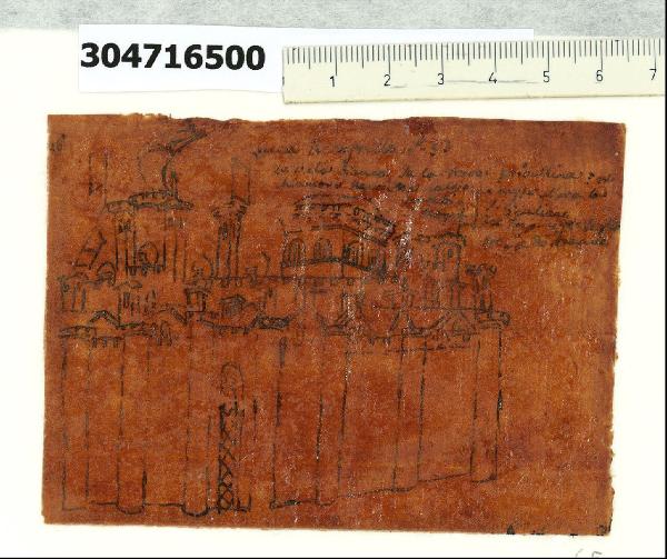 - NOTIZIE STORICO CRITICHE Nell'"Indice" del tomo nel quale il marchese Giacomo Sardini lo aveva rilegato, il disegno viene definito: "Sieguono alcune elucidazioni ricavate dalla Storia Originale di Gio Sercambj nell'Archivio Segreto ... Veduta di Lucca ove si vede il suo Castello p. 53 e la vela sulla Torre ghibellina per chiamare Uguccione. Altra ne messe la Torre di S. Giuliano al tempo dell'Imperator Carlo re di Boemia".\nLa grafia delle iscrizioni su questo gruppo di disegni, di cui fa parte quello in esame, è riconducibile alla mano di Sardini, che pertanto si può ritenere l'esecutore dei lucidi. Il supporto, reso trasparente per impregnazione con resina, venne adattato all'esigenza del ricalco su esigue superfici suddividendolo in quattordici piccoli rettangoli. A copiatura ultimata, questi furono incollati in bell'ordine su due carte inserite nella legatura del tomo. L'occasione di procurarsi riproduzioni dal codice tardo trecentesco con le Croniche di Sercambi si dischiuse a Sardini quando ottenne un permesso speciale per accedere alla Tarpea (l'Archivio segreto della Repubblica, oggi in Archivio di Stato), che custodiva quei preziosi manoscritti. Intento a raccogliere appunti dai documenti antichi per arricchire i suoi contributi dedicati alla storia artistica locale, il marchese non esitò a copiare alcune illustrazioni del manoscritto, oggetto di studio anche da parte di altri suoi contemporanei. Catturarono la sua attenzione soprattutto i centri fortificati dei dintorni di Lucca fino a Pisa, ma anche particolari di costume. Il copista preferì soffermarsi solo su dettagli dei riquadri figurati e, nei vari lucidi, si possono trovare brani tratti da una sola (come nel caso in esame riconducibile al capitolo CXLI del manoscritto) o da più vignette.