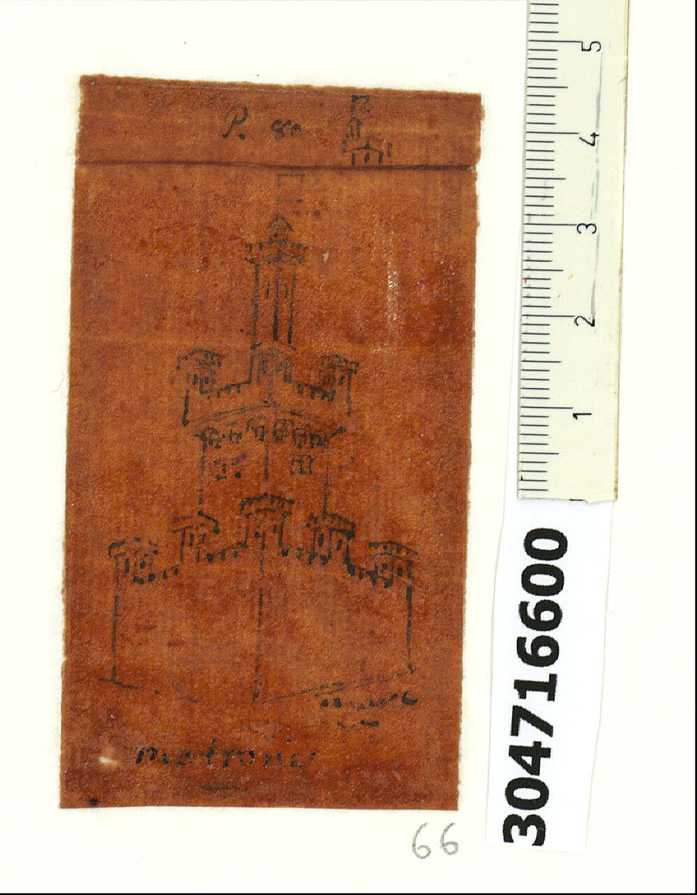 - NOTIZIE STORICO CRITICHE Nell'"Indice" del tomo nel quale il marchese Giacomo Sardini lo aveva rilegato, il disegno viene definito: "Sieguono alcune elucidazioni ricavate dalla Storia Originale di Gio Sercambj nell'Archivio Segreto ... Torre di Motrone meglio distinta di quella di sopra p. 80".\nLa grafia delle iscrizioni su questo gruppo di disegni, di cui fa parte quello in esame, è riconducibile alla mano di Sardini, che pertanto si può ritenere l'esecutore dei lucidi. Il supporto, reso trasparente per impregnazione con resina, venne adattato all'esigenza del ricalco su esigue superfici suddividendolo in quattordici piccoli rettangoli. A copiatura ultimata, questi furono incollati in bell'ordine su due carte inserite nella legatura del tomo. L'occasione di procurarsi riproduzioni dal codice tardo trecentesco con le Croniche di Sercambi si dischiuse a Sardini quando ottenne un permesso speciale per accedere alla Tarpea (l'Archivio segreto della Repubblica, oggi in Archivio di Stato), che custodiva quei preziosi manoscritti. Intento a raccogliere appunti dai documenti antichi per arricchire i suoi contributi dedicati alla storia artistica locale, il marchese non esitò a copiare alcune illustrazioni del manoscritto, oggetto di studio anche da parte di altri suoi contemporanei. Catturarono la sua attenzione soprattutto i centri fortificati dei dintorni di Lucca fino a Pisa, ma anche particolari di costume. Il copista preferì soffermarsi solo su dettagli dei riquadri figurati e, nei vari lucidi, si possono trovare brani tratti da una sola (come nel caso in esame riconducibile al capitolo CXCVII del manoscritto) o da più vignette.