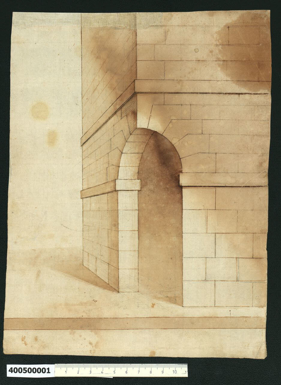- NOTIZIE STORICO CRITICHE Nell'"Indice" del tomo nel quale era rilegato, il disegno viene definito: "Canto sostenuto in aria con chiavi di pietra".\nIl disegno raffigura la porzione angolare di un edificio, aperta al piano terra da un arco. Il paramento murario è realizzato con pietre di taglio regolare ed è ornato da fasce marcapiano lisce.