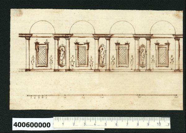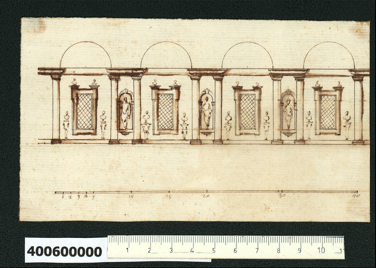 - NOTIZIE STORICO CRITICHE Nell'"Indice" del tomo nel quale era rilegato, il disegno viene definito: "Spaccato di una galleria di Gio: da Udine". Nonostante l'attribuzione a Giovanni da Udine, il confronto stilistico la nega, sembra piuttosto un disegno di buona scuola manierista.\nIl disegno raffigura la parete di una galleria suddivisa in campate da coppie di colonne doriche che creano interassi di diversa ampiezza. In quelli più stretti sono collocate nicchie contenenti statue e figura intera; in quelli più larghi sono inserite finestre dal profilo geometrico fiancheggiate da mensole reggenti dei busti.