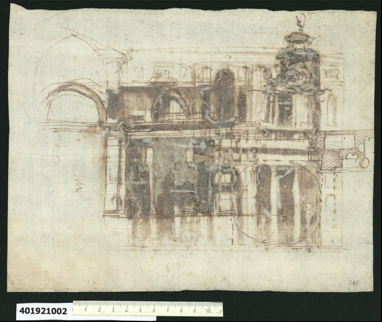 - NOTIZIE STORICO CRITICHE Nell'"Indice" del tomo nel quale era rilegato, il disegno viene definito: "Altri detti come sopra" (leggi: "Schizzi per palazzi").\nIl disegno, poco leggibile, si riferisce alla sezione e pianta parziali di una chiesa. La struttura è impostata su pilastri con lesene addossate che reggono una trabeazione sulla quale si innesta la volta a botte con veletta unghiata per l'apertura di una finestra. La pianta si riferisce, probabilmente, alla zona del transetto coperta a cupola; ai lati è tracciata l'articolazione della parete, ornata da lesene e e colonne libere e scavata da nicchie.