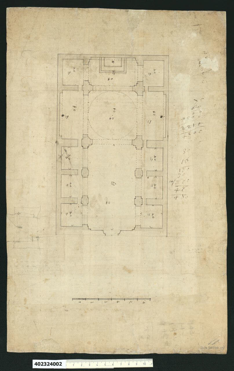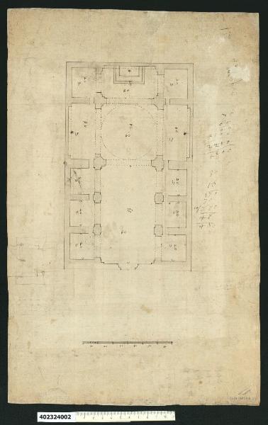 - NOTIZIE STORICO CRITICHE Nell'"Indice" del tomo nel quale era rilegato il disegno viene definito: "Pianta di Chiesa" (il foglio con n. moderno 24 corrisponde a quanto citato in indice al n. 21).\nNon vi sono sul disegno elementi sufficienti per l'identificazione della chiesa rappresentata nè dell'autore, tuttavia si può notare che si tratta di uno schema di pianta tipico delle chiese dei gesuiti: un'aula rettangolare con navata unica e transetto che formano una a croce latina al cui centro si erge una cupola e cappelle laterali chiuse ai lati o, come in questo caso, con uno stretto passaggio che stacca il pilastro dal muro. Sul disegno sono presenti conti e uno schizzo a grafite probabilmente riferito a un passaggio con anta di una porta.