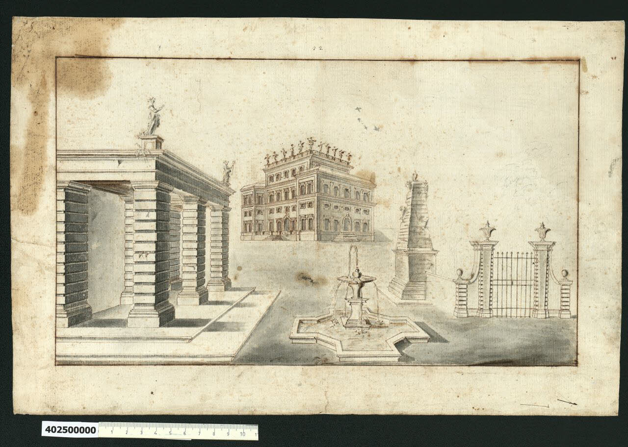 - NOTIZIE STORICO CRITICHE Nell'"Indice" del tomo nel quale era rilegato il disegno viene definito: "Schizzi per ville di D. Filipo Iuva /ra".\nQuesta particolare veduta prospettica è al centro di interpretazioni ancora non risolte. Gli elementi che la compongono sono eterogenei. Sulla sinistra vi è un porticato rialzato su due gradoni, con pilastri a fasce di bugnato e una copertura piana, ai cui estremi sono collocate due statue di figure femminili poste su un piedistallo. In primo piano è rappresentata una fontana dalla vasca cruciforme ad angoli interni smussati. Più arretrato sulla destra è collocato un cancello in ferro sostenuto da pilastri bugnati con fascia liscia anteriore e vaso soprastante, raccordati da un elemento curvo a pilastrini laterali bugnati e da uno di questi, attraverso un muretto basso, a un obelisco di pietra in rovina. Infine, sullo sfondo, si staglia la rappresentazione di una maestosa costruzione, già identificata con villa Rospigliosi - detta "di Spicchio" - di Lamporecchio, comunemente ritenuta opera progettata da Gian Lorenzo Bernini e costruita dall'allievo Mattia de' Rossi, probabilmente all'epoca di Clemente IX (1667-69), nome assunto da Giulio Rospigliosi all'inizio del suo pontificato.\nDa un confronto con la rappresentazione della villa di questo disegno e un'altra appartenente alle tavole del Campione Rospigliosi conservato nel fondo Rossi-Cassigoli della Biblioteca Nazionale Centrale di Firenze, sono state rilevate delle differenze che fanno pensare a un rilievo sommario e a una importanza secondaria dell'edificio stesso all'interno della composizione della tavola, mentre la fontana, oggi circolare, appare della stessa forma cruciforme di quella rappresentata in una stampa del 1757 dallo Zocchi (Cozzi 1991, cit.).\nL'arco temporale di realizzazione del disegno dovrebbe quindi essere circoscritto tra la fine del XVII secolo e il primo decennio del XVIII.\nRiguardo all'attribuzione, sono state avanzate due diverse ipotesi, dopo quella di Oechslin del 1975 che lo indicava di "Anonimo romano" : la prima, in accordo con la dicitura riportata nell'indice di Sardini e sulla scorta di concordanze grafiche, fa riferimento a Filippo Juvarra (Scotti 1976, p. 63), mentre la seconda, sempre in ragione di analogie stilistiche, propende per una realizzazione di Johann Bernhard Fischer von Erlach (Lorenz 1991, Z 397 p. 326), di cui sono famose le scenografie architettoniche e la predilezione per le architetture di Bernini.