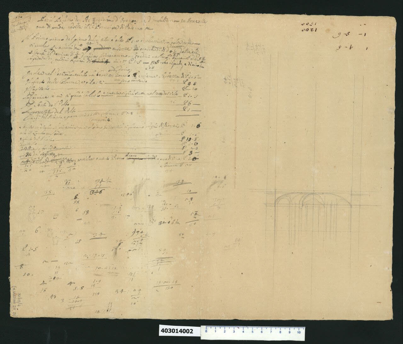 - NOTIZIE STORICO CRITICHE Il disegno, tracciato sul verso del supporto del precedente (Milano, Collezione Sardini Martinelli inv. 4,30bis/4 R), rappresenta un altro schizzo in sezione forse più definito, del vestibolo d'ingresso. A lato sono riportati appunti di calcolo e una descrizione con le dimensioni di tutti gli elementi componenti. Si tratta forse di una variante successiva alla soluzione di cui all'inv. 4,30bis/3 R, dove la stessa descrizione appare cassata da due linee verticali.\nImportante in questo disegno è l'iscrizione che precede la descrizione, che riporta non solo la data di esecuzione del progetto, riferita al 12 aprile 1696, ma specifica che la nota è "per il Palazzo del Re Wiglielmo d'Oranges re d'Inghilterra in Bruxelles ove di parte habita il S.re Principe di Vademonte" definendo così inequivocabilmente la proprietà del palazzo.