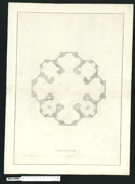 - NOTIZIE STORICO CRITICHE Nell'"Indice" del tomo nel quale era rilegato il disegno viene definito: "Pianta d'un Caffeaos in Vienna". Prima della rilegatura nel tomo IV da parte di Giacomo Sardini, questo disegno era inglobato nel tomo II e indicato al n. 44 della "Spiegazione de Numeri", insieme al n. 43, come "Altre d.e p. 2 al[t]re Fabb a Vienna".\nL'identificazione del disegno non è certa, perché l'unico riferimento è la scala grafica in piedi di Vienna. Vi è raffigurata la pianta di un piccolo edificio costituito da una struttura centrale di forma ottagonale, probabilmente coperta da una cupola, intorno a cui si aprono alternativamente ambienti di forma esagonale allungata (a losanga) e di forma circolare, che però esternamente si configurano anch'essi con un lato retto tra due obliqui, in cui si aprono le finestre che illuminano l'interno. La geometria complessiva dell'impianto richiama quindi due quadrati con angoli smussati intersecati tra loro a quarantacinque gradi.\nDue degli ambienti a pianta circolare, rappresentati nel disegno in basso, sono occupati da due scale a lumaca; perciò si suppone che vi fosse un ulteriore piano inferiore o anche un ballatoio superiore.\nIl disegno è attribuito da Hellmut Lorenz a Domenico Martinelli e l'ipotesi è suffragata sia dall'analisi grafologica dell'iscrizione riportata sulla scala grafica, già riscontrata in altri disegni di sicura attribuzione, sia dalla predilezione di Martinelli per impianti centrali di questo genere, frequenti tra i suoi progetti: nel casino del giardino progettato per Stockhammer (Milano, Collezione Sardini Martinelli inv. 9,27) o in quello per il conte Harrach (Milano, Collezione Sardini Martinelli inv. 9,35) o in piccoli edifici religiosi come la cappella del monastero di Lubiana progettato per l'Ordine dei Cavalieri Teutonici (Milano, Collezione Sardini Martinelli inv. 9,32) e altre cappelle ottagonali.\nLorenz, che ipotizza un riferimento di Martinelli alle idee di Giovanni Battista Montano, da lui conosciuto a Roma e di cui aveva collezionato diversi disegni (Milano, Collezione Sardini Martinelli tomi V e VI), pensa che questo disegno possa raffigurare un casino per il giardino del palazzo viennese del marchese Obizzi, di cui si parla in un foglio di un manoscritto di Martinelli conservato a Lucca (Biblioteca Statale di Lucca, ms. 1856, f. 81), realizzato nel primo periodo di permanenza dell'architetto lucchese a Vienna (1690-94).