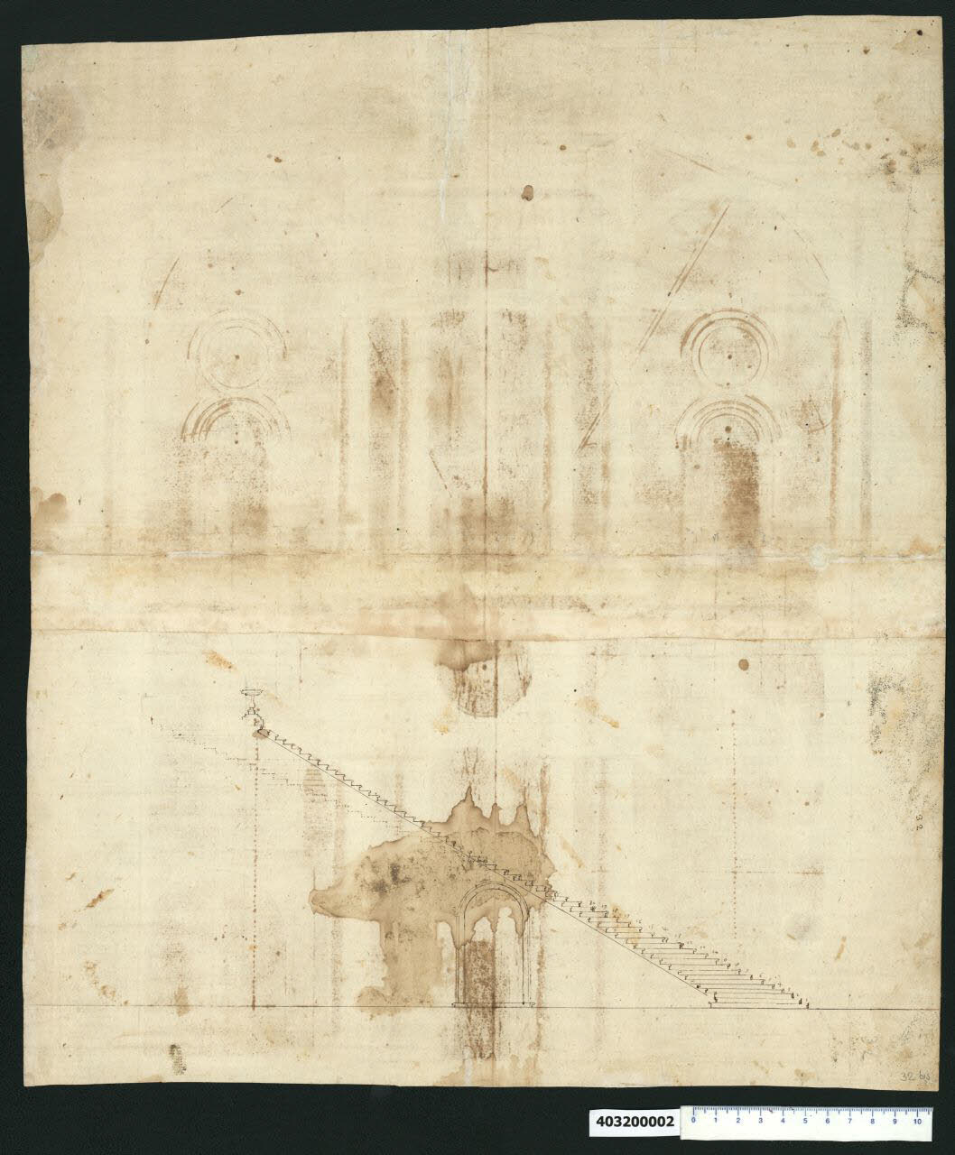 disegno che conserva tracce della preliminare costruzione a grafite; è eseguito a inchiostro bruno a penna con tiralinee, compasso; il supporto sul quale è tracciato è composto da due fogli incollati di carta avorio