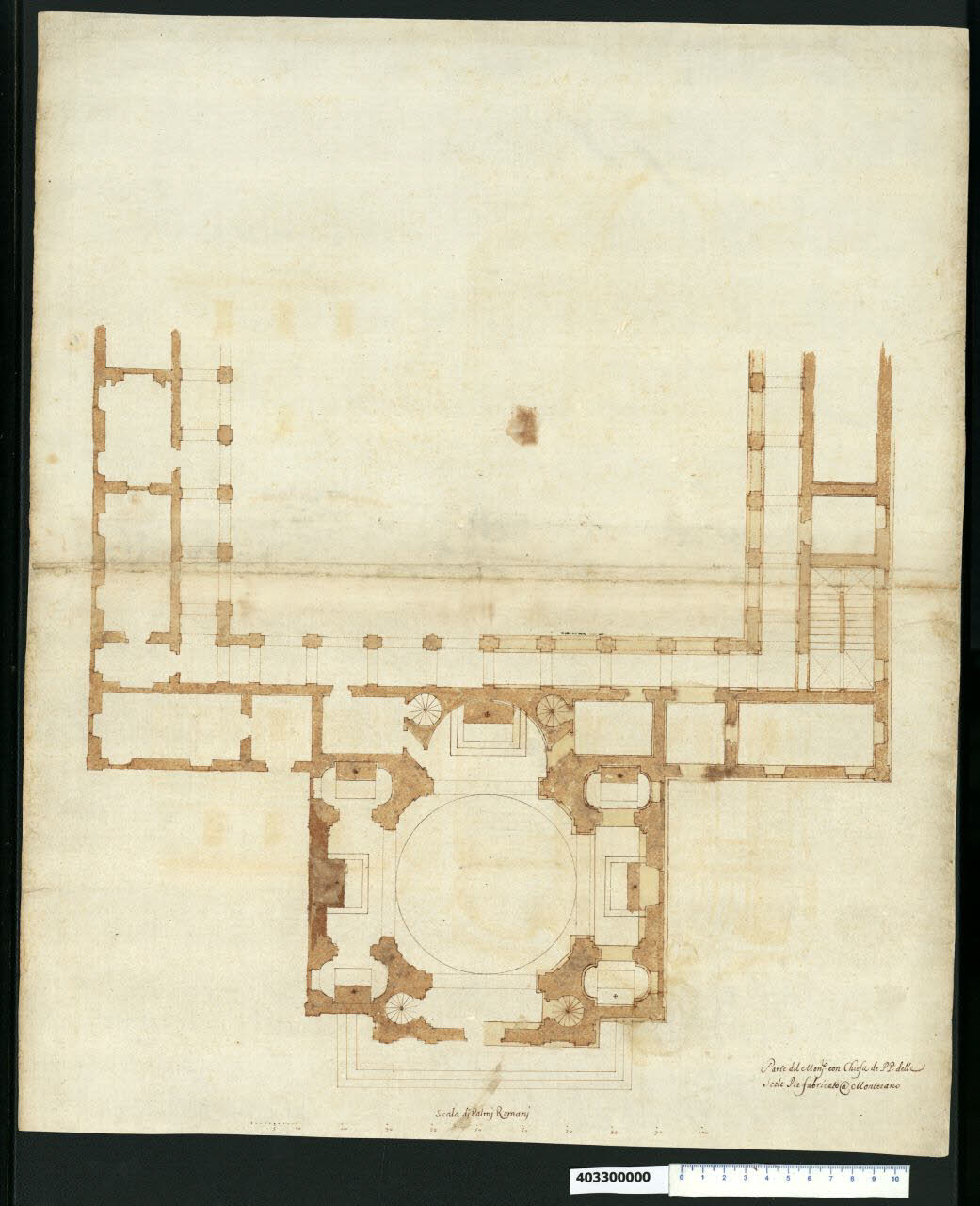 - NOTIZIE STORICO CRITICHE Nell'"Indice" del tomo nel quale era rilegato, il disegno viene definito: "Pianta della Chiesa de PP. delle Scuole Pie e parte di Monastero fabbricato a Monterano". Si tratta della pianta della chiesa e di parte del convento di S. Bonaventura dei Padri Scolopi a Monterano (Nobile 1991). L'edificio venne impostato nelle linee generali dal Bernini mentre il progetto definitivo e l'esecuzione furono affidati a Mattia De Rossi che la iniziò nel 1675 (Heger 1978, p. 70). Il presente disegno è una copia fedele del Martinelli della tavola conservata nell'Archivio generalizio dei Padri Scolopi, e rientra nel settore della produzione martinelliana (conservato in Milano, Collezione Sardini Martinelli) dedicato alla riproduzione di progetti redatti da altri architetti come Ottaviano Mascherino e Giovanni Antonio De Rossi.