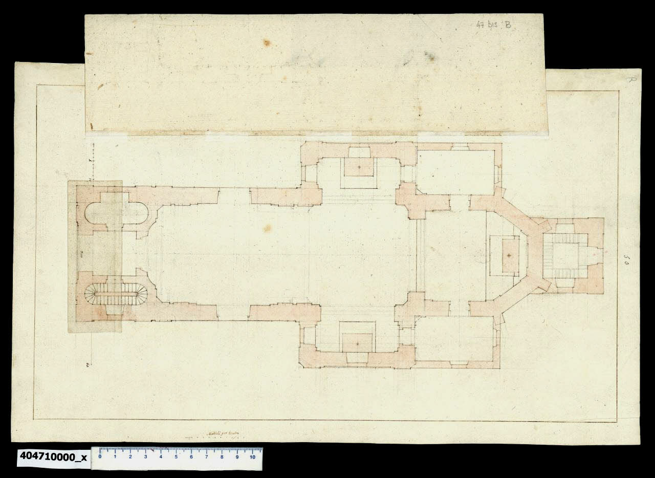 disegno in scala che conserva tracce della preliminare costruzione a grafite; è eseguito a inchiostro bruno a penna con tiralinee e compasso; acquerello rosa nello spessore delle murature; il disegno è tracciato su carta avorio e presenta a sinistra due varianti sovrapposte l'una all'altra tracciate su pezzi di carta avorio incollati: la prima è relativa alla metà sinistra della pianta dall'ingresso al presbiterio; la seconda si limita alla metà della navata; un'altra variante è tracciata su un pezzo di carta incollato in corrispondenza dell'ingresso; il disegno presenta una marginatura tracciata con inchiostro bruno