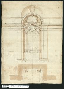 - NOTIZIE STORICO CRITICHE Nell'"Indice" del tomo nel quale era rilegato, il disegno viene definito: "Altare di Tarquinio Ligusti da Viterbo fatto per il Sig.r Massimo Massimi per S. Gio. Laterano".\nTarquinio Ligustri, nato a Viterbo nel 1564, era in contatto con il principe Massimo de' Massimi fin dal 1602, quando affrescò la volta della galleria nel palazzo Massimo alle Colonne in Roma. La famiglia Massimi possedeva una cappella in S. Giovanni in Laterano, dove nel 1644 venne seppellito il principe Massimo. L'altare raffigurato nel presente disegno potrebbe riferirsi proprio a questa cappella; è ubicato in un vano a pianta rettangolare delimitato ai lati da lesene doriche e si innalza sopra due scalini. Sopra la mensa due colonne corinzie inquadrano la pala d'altare e reggono una trabeazione spezzata al centro per ospitare un tondo che invade anche lo spazio interno del timpano curvilineo; quest'ultimo è a sua volta interrotto nella parte centrale curvilinea per l'inserimento di un timpano triangolare più piccolo.