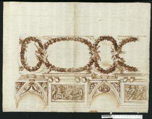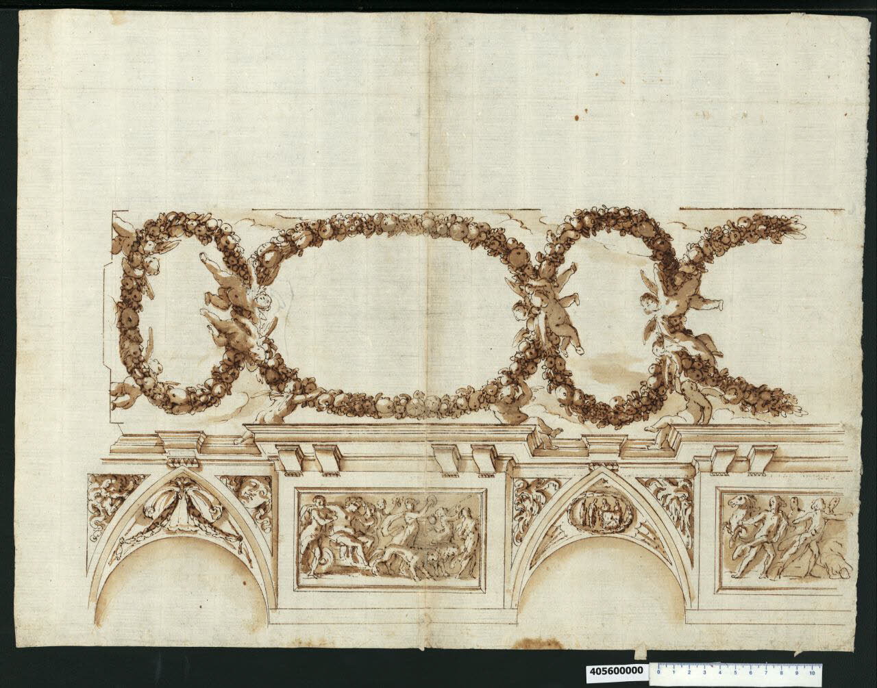 - NOTIZIE STORICO CRITICHE Il disegno, contrassegnato con n. antico 58.2°, non è citato nell' "Indice" del tomo in cui era rilegato.\nNon esistono indicazioni per individuare la localizzazione dell'opera e l'autore del disegno, tuttavia da un'analisi stilistica si ritiene che potrebbe trattarsi di una decorazione realizzata in ambito romano tra la fine del XVI secolo e l'inizio del XVII.\nIl disegno rappresenta in prospettiva la zona di parete in prossimità del soffitto, che è raffigurato invece proiettato in pianta. La prima è costituita da una serie di elementi architettonici - campiture con volte a spicchio centrali e campiture rettangolari incorniciate aggettanti - alternati tra loro e uniti da un cornicione sagomato che segue gli sporti e le rientranze degli elementi, sorretto da mensole piatte con dentelli. Le campiture voltate sono decorate con motivi vegetali, una conchiglia con festoni, un volto e un ovale con figure; quelle rettangolari racchiudono delle scene con figure in movimento.\nSopra il cornicione sono adagiati degli angioletti che sorreggono idealmente la decorazione del soffitto, a ghirlande di fiori e frutti intrecciate a formare ovali di due diverse dimensioni e orientamento, insieme ad altri angeli che si librano in corrispondenza degli intrecci.