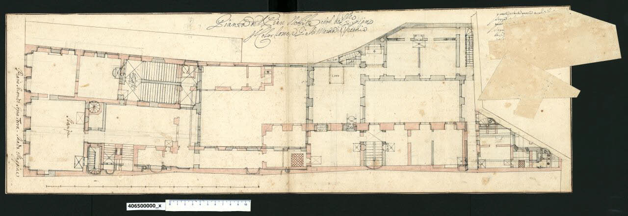 disegno che conserva tracce della preliminare costruzione a grafite; è eseguito a inchiostro nero e bruno a penna parte con tiralinee e compasso e parte a mano libera per modifiche, acquerello colore grigio per le murature esistenti, colore originariamente rosso e giallo (entrambi sbiaditi) per quelle modificate; il supporto sul quale è tracciato è carta chiara pesante imbrunita e presenta puntinature di costruzione del disegno e una marginatura a inchiostro bruno; sul supporto in alto a destra sono incollate due carte sagomate per varianti