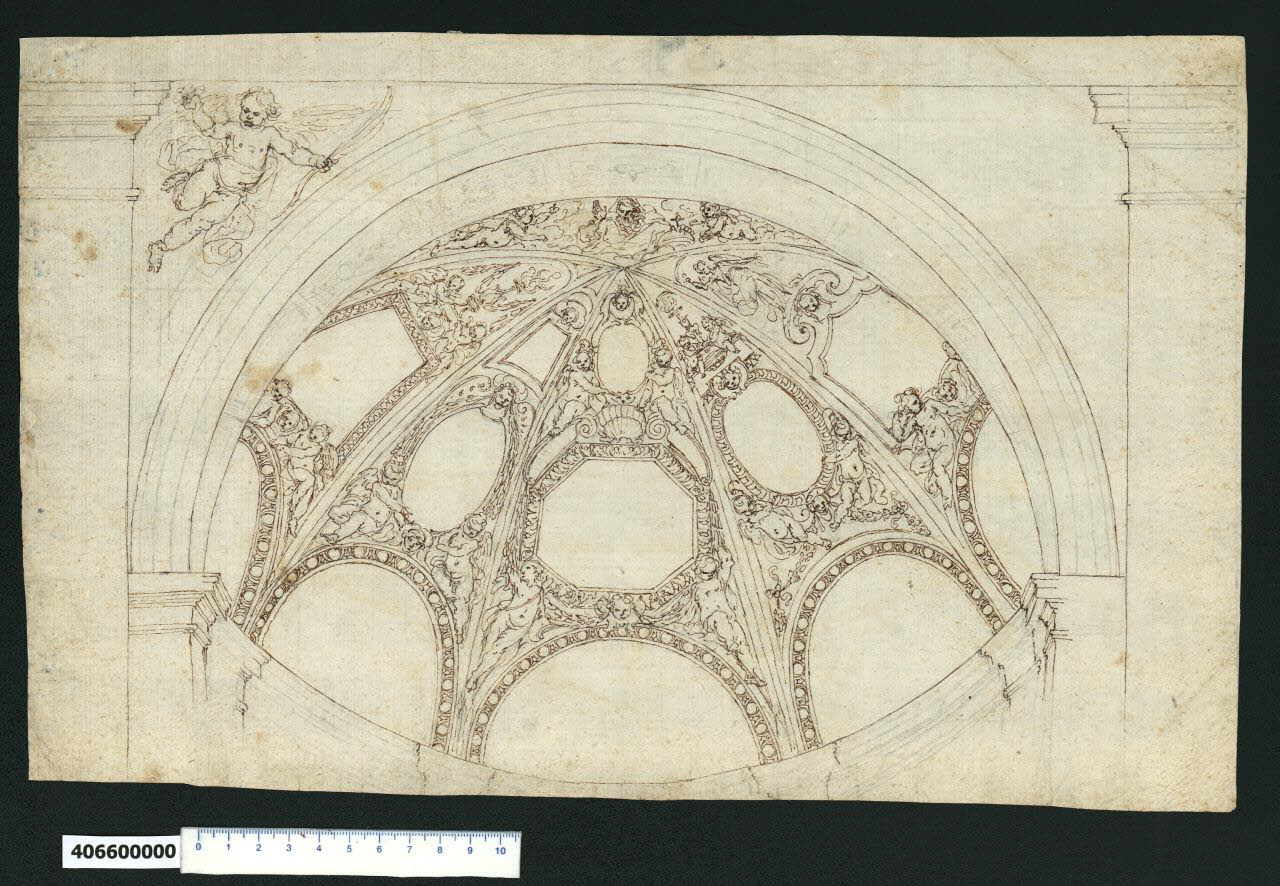 - NOTIZIE STORICO CRITICHE Nell'"Indice" del tomo nel quale era rilegato il disegno viene definito: "Ornato per una Cupola".\nNon esistono indicazioni per individuare la localizzazione dell'opera e l'autore del disegno, che sembra essere un campionario di soluzioni decorative per la varietà di forme delle campiture inserite negli spicchi della cupola e per il repertorio ornamentale degli interstizi: angeli cherubini, testine, conchiglie, candelabri fumanti, ghirlande e la figura di Dio benedicente alla sommità della cupola. Fuori campo, tra l'arco d'ingresso alla cappella voltata e il pilastro laterale, una bella figura d'angioletto drappeggiato, che tiene in una mano una piuma e nell'altra una colomba.\nSi può comunque avanzare l'ipotesi che il disegno possa appartenere all'ambito dell'Italia centrale del tardo Cinquecento.