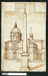 - NOTIZIE STORICO CRITICHE Nell'"Indice" del tomo nel quale era rilegato, il disegno viene definito: "Stato antico di S. Gio. Laterano".\nIl disegno in realtà raffigura la parte absidale della chiesa di S. Maria Maggiore a Roma prima degli interventi di Flaminio Ponzio per la costruzione della cappella Paolina (1605-1613). Si vedono infatti la cappella Sistina fatta erigere tra il 1585 e il 1587 da Sisto V su progetto di Domenico Fontana. In primo piano l'obelisco qui eretto per volontà d Sisto V nel 1587 ad opera di Domenico Fontana.