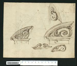 - NOTIZIE STORICO CRITICHE Gli studi di volute inserite tra un frontone curvilineo spezzato e la parte terminale di un pilastro, potrebbero essere state eseguite dalla stessa mano che ha tracciato il disegno sul recto del foglio. Non sono comunque in riferimento ai soggetti ivi rappresentati.