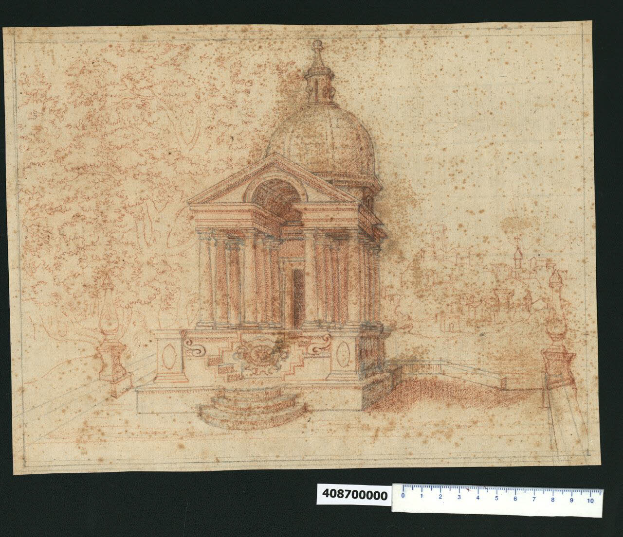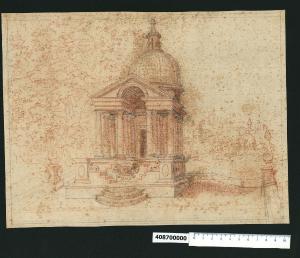 - NOTIZIE STORICO CRITICHE Nell'"Indice" del tomo nel quale era rilegato, il disegno viene definito: "Tempietto in prospettiva".\nIl disegno riproduce in veduta prospettica il tempietto ottagonale presente nel "Sacro Bosco" di Bomarzo, tra le opere realizzate in occasione della sistemazione di un'ampia area verde voluta da Vicino Orsini e realizzata tra il 1552 e il 1584. Il tempietto venne costruito come sacello funerario alla morte di Giulia Farnese, moglie dell'Orsini; la data della sua morte è sconosciuta ma una lapide conservata nella chiesa parrocchiale parla di lei nel 1546 (Bruschi 2000, pp.133-134). Il tempietto a pianta ottagonale con antistante portico di ordine dorico poggia su un alto basamento. Al centro del frontone si apre un arco corrispondente alla volta a botte del portico, ornata con le rose orsiniane.\nIl foglio potrebbe essere in relazione con un altro conservato in Milano, Collezione Sardini Martinelli inv. 4,38 raffigurante un elefante