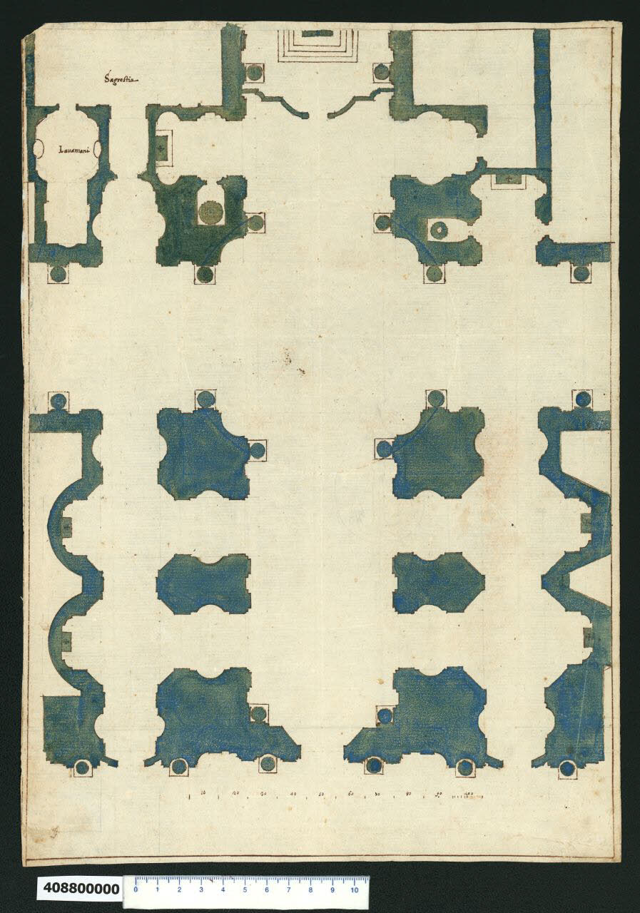 - NOTIZIE STORICO CRITICHE Nell'"Indice" del tomo nel quale era rilegato, il disegno viene definito: "Pianta di Chiesa".\nIl disegno mostra due soluzioni per una chiesa a pianta longitudinale. Dalla facciata, dotata di tre ingressi sottolineati da colonne alveolate, si accede all'interno suddiviso in tre campate da grossi pilastri compositi. Nella parte destra del foglio sono previste due cappelle a pianta trapezoidale, mentre in quella di sinistra due cappelle a pianta semicircolare, i cui volumi sporgono dal filo esterno della parete. La zona centrale del transetto, coperta da una cupola, è delimitata dai grossi pilastri con colonne addossate, che rimandano alla soluzione bramantesca per la basilica di S. Pietro a Roma. Nello spessore dei pilastri prossimi al presbiterio sono state inserite due scale a lumaca. Sul lato sinistro del presbiterio si trovano la sagrestia e il locale lavamani; sulla destra altri due ambienti la cui destinazione non è specificata sul disegno.