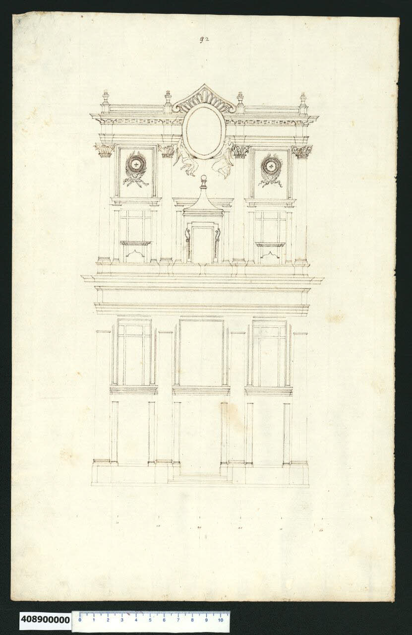 - NOTIZIE STORICO CRITICHE Nell'"Indice" del tomo nel quale era rilegato, il disegno viene definito: "Schizzo di facciata di Chiesa".\nIl foglio mostra il ridisegno della facciata della chiesa di S. Carlino progettata da Francesco Borromini nel 1660-62. Nel disegno l'ordine inferiore è solo abbozzato nei suoi elementi principali: le colonne giganti fiancheggiate da un ordine minore la cui trabeazione funge da base delle nicchie superiori. Queste sono contornate da cornicioni e fasce che a loro volta reggono la grande trabeazione. L'intercolumnio centrale, molto più largo dei laterali, è destinato a ospitare il portale. La facciata che osserviamo oggi è il prodotto di due mani: la parte inferiore è del Borromini, costruita tra il 1665 e il 1667, mentre quella superiore è del nipote Bernardo cui si deve l'assetto definitivo dell'ordine superiore. A questo livello si trovano, corrispondenti a quelle sottostanti, quattro colonne e sei colonne più piccole; negli intercolumni sono collocate le nicchie e la grande finestra centrale protetta da balaustra. La facciata termina con un alto cornicione al centro del quale spiccano due angeli in volo che reggono il medaglione destinato alla raffigurazione della Trinità.