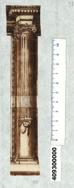 - NOTIZIE STORICO CRITICHE Nell'"Indice" del tomo nel quale era rilegato, il disegno viene definito: "Colonne Doriche composte".\nIl disegno raffigura l'alzato di una colonna ionica con fusto diviso in due parti: quella inferiore liscia, ornata con teste alate di cherubino che reggono ghirlande, è separata tramite un collarino dalla superiore scanalata. Tra le volute del capitello è appeso un festone. Il disegno, che è ritagliato e mostra ai lati della colonna l'inizio di un'apertura trabeata (finestra?), fa parte di una serie di 5 colonne analoghe (Milano, Collezione Sardini Martinelli inv. 4,91; 4,92; 4,94; 4,95) che forse costituivano originariamente una sequenza di aperture e sostegni per una facciata di palazzo.
