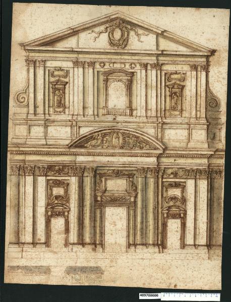 - NOTIZIE STORICO CRITICHE Nell'"Indice" del tomo nel quale era rilegato, il disegno viene definito: "Altra facciata di Chiesa".\nNel 1593 il cardinale Angelo Cesi decide di finanziare la costruzione della nuova facciata della chiesa. Martino Longhi presenta un modello, mentre progetti vengono predisposti da Giacomo Della Porta, Giovanni Antonio Dosio, Fausto Rughesi da Montepulciano e da un certo Leonardo da Todi. La scelta cade sul progetto del Rughesi. La costruzione inizia nel 1594 e termina nell'arco di un decennio. Il presente disegno viene attribuito a Giacomo Della Porta o alla sua cerchia; è raffigurata una facciata su due ordini con quello superiore più stretto, raccordato al sottostante tramite volute. Lesene e colonne articolano il primo ordine in campate entro le quali si aprono il portale centrale, sormontato da un timpano curvilineo, e le porte laterali. In asse con queste aperture, al livello superiore, si trovano una finestra dotata di balaustra e due nicchie. Un frontone triangolare conclude la composizione.