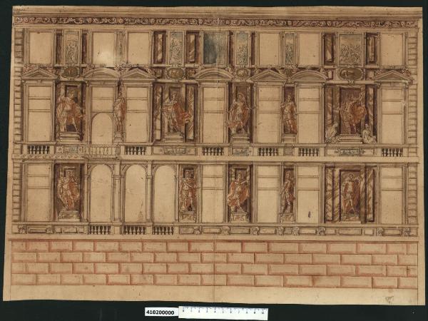 - NOTIZIE STORICO CRITICHE Nell'"Indice" del tomo nel quale era rilegato il disegno viene definito: "Facciata di Casa molto irrego / lare da riordinarsi con la pittura".\nNon è stato possibile identificare l'autore del disegno, né il palazzo raffigurato. La composizione variegata e asimmetrica della facciata fa pensare più a un disegno di teoria con soluzioni progettuali diversificate, che non a un edificio realmente esistente.\nGli elementi che si ritrovano diversamente assemblati sopra un'alta zoccolatura a bugnato, sono: marcapiani con balaustre, riquadrature, mensole o pannelli decorativi; finestre rettangolari più alte al primo e secondo piano ma con serramento suddiviso in tre campiture, ad eccezione di tre aperture ad arco inframmezzate da colonnine al primo piano e una finestra con serramento suddiviso e arco sottostante al secondo piano sulla sinistra, che si affaccia sull'unico balconcino aggettante dell'intera facciata; campiture di sette dimensioni diverse con nicchie e statue di figure in veste di antichi romani ritratti in varie pose e su due tipi di piedistallo per il primo e secondo piano; pannelli decorativi con bassorilievi dal fondo azzurro all'ultimo piano, con o senza riquadrature laterali e una nicchia centrale isolata con fondo azzurro al medesimo piano. Le finestre del secondo piano hanno frontoni alternativamente triangolari e curvilinei e sono inframmezzato da ovali incorniciati. Nella prima campitura a destra del secondo piano, ai piedi del romano, vi sono due schiavi ignudi legati e accovacciati. L'edificio si conclude con una fascia decorativa a sfondo scuro e un cornicione.\nNel disegno si possono notare delle analogie con un altra raffigurazione di facciata della Collezione (Milano, Collezione Sardini Martinelli inv. 4,100), come la rappresentazione delle volute nella parte centrale come se fossero viste in prospettiva, l'inserimento di statue in abito romano stilisticamente simili a quella raffigurata nella decorazione centrale dell'altro palazzo, le fasce decorative orizzontali a sfondo bruno, finestre divise nel serramento da traverse orizzontali e il bugnato alle estremità del palazzo.\nSe anche non fosse stata la stessa mano a stendere i due disegni, probabilmente sono stati realizzati nello stesso ambito e negli stessi anni.