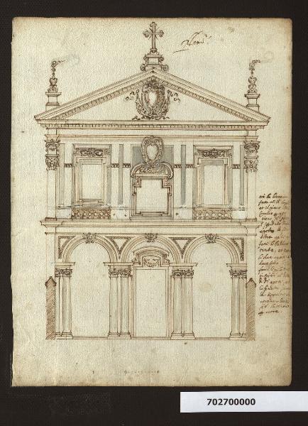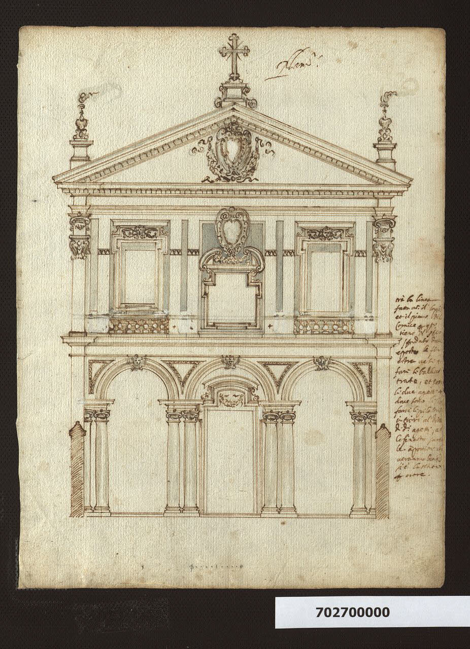 - NOTIZIE STORICO CRITICHE Nell'"Indice" del tomo nel quale era rilegato, il disegno viene definito: "Idea per facciata di Chiesa".\nIl foglio fa parte di una serie di porte disegnate da G.B. Mola e contrassegnate dalla sigla "Flam", o "Flam. P." oppure "F.P." (Milano, Collezione Sardini Martinelli inv. 7,22; 7,31; 7,34; 7,55) per indicare opere di Flaminio Ponzio.\nIl disegno pubblicato per la prima volta da Noehles (1996, p. 16, fig. 4) riproduce il progetto originario di Flaminio Ponzio per la nuova facciata della basilica di S. Sebastiano fuori le mura a Roma, voluta da Scipione Borghese alla fine del 1607. Il progettista fu Flaminio Ponzio, che si occupò direttamente del cantiere fino all'estate del 1611. Le differenze tra il disegno e l'edificio costruito riguardano la trabeazione sommitale realizzata in forma sintetica, il timpano che nella facciata eseguita appare tripartito dalla prosecuzione dell'ordine a fasce, e molti elementi d'ornato. Come appare dalle correzioni sovrapposte al disegno e accompagnate dalle scritte sul margine destro, alla definizione della parte superiore del prospetto si interessò lo stesso Mola, presente nel cantiere come fratello e collaboratore del capomastro Domenico. Una sola delle proposte di Giovan Battista venne accolta: l'unico piedistallo per la coppia di colonne (Antinori 1999, pp. 309-310, scheda 167).