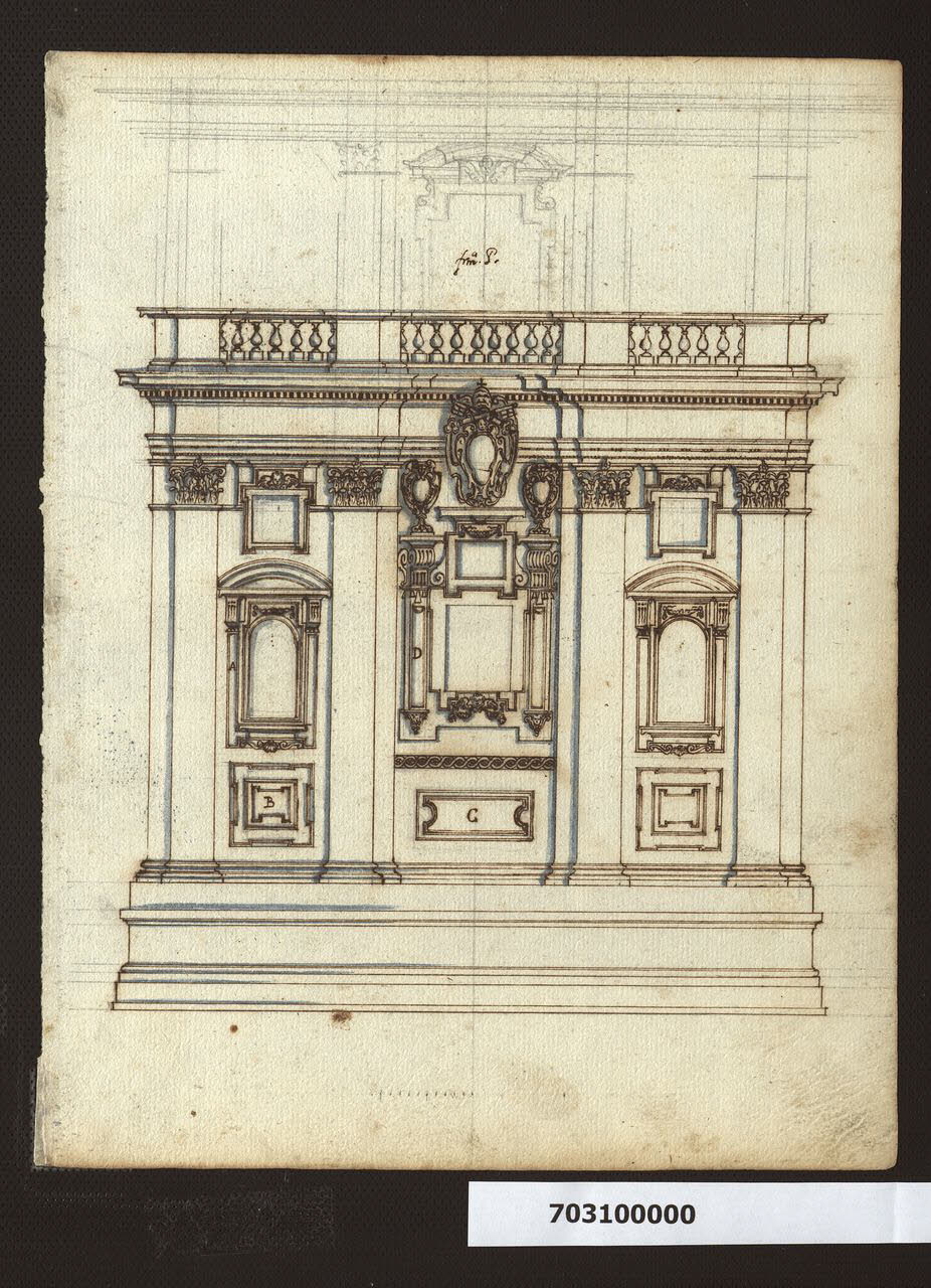 - NOTIZIE STORICO CRITICHE Nell'"Indice" del tomo nel quale era rilegato, il disegno viene definito: "Facciata".\nIl foglio fa parte di una serie di porte disegnate da G. B. Mola e contrassegnate dalla sigla "Flam", o "Flam. P." oppure "F.P." (Milano, Collezione Sardini Martinelli inv. 7,22; 7,27; 7,34; 7,55) per indicare opere di Flaminio Ponzio, architetto con il quale il Mola aveva lavorato nel cantiere della facciata di S. Sebastiano fuori le mura (cfr. Milano, Collezione Sardini Martinelli inv. 7,27).\nNel 1605 Paolo V Borghese concepisce un programma di interventi in S. Maria Maggiore affidandone l'esecuzione a Flaminio Ponzio. Al centro di tale programma c'era la costruzione di un nuova grande cappella simmetrica a quella eretta vent'anni prima da Sisto V. La costruzione della cappella Paolina inizia nell'estate del 1605 e termina nel 1615. Il disegno del Mola è diverso da quello originale del Ponzio nella partizione della balaustrata e in alcuni dettagli dell'apparato decorativo. La presenza della balaustra sopra il primo ordine indica che il foglio si riferisce alla facciata nord-ovest della cappella, cioè quella applicata sul volume della sua sagrestia (Antonori 1999, p. 242, scheda 119b).