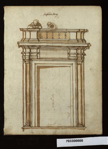 - NOTIZIE STORICO CRITICHE Nell'"Indice" del tomo nel quale era rilegato, il disegno viene definito: "Porta di Fabio Mattei".\nCome informa la scritta apposta al margine superiore del foglio "Defabio Matej", la porta disegnata dal Mola è quella del palazzo di Fabio Mattei, l'attuale palazzo Mattei di Paganica a Roma, attribuita a Nanni di Baccio Bigio. Il portale architravato è delimitato lateralmente da colonne alveolate di ordine dorico. La trabeazione è interrotta al centro da una cartella priva di scritte nel disegno ma destinata ad ospitare la dedica, a lettere capitali "LVD.MATTHAEIVS.PETR / ANT.FIL.LVD.NEPOS".