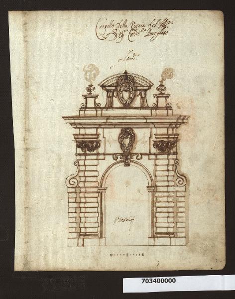 - NOTIZIE STORICO CRITICHE Nell'"Indice" del tomo nel quale era rilegato, il disegno viene definito: "Cancello della Vignia del Cav. Borghese col nome di Gio. Batta Mola".\nIl foglio fa parte di una serie di porte disegnate da G. B. Mola e contrassegnate dalla sigla "Flam", o "Flam. P." oppure "F.P." (Milano, Collezione Sardini Martinelli inv. 7,22; 7,27; 7,31; 7,55) per indicare opere di Flaminio Ponzio, architetto con il quale il Mola aveva lavorato nel cantiere della facciata di S. Sebastiano fuori le mura (cfr. Milano, Collezione Sardini Martinelli inv. 7,27).\nLa porta venne progettata dal Ponzio per la villa del Cardinale Borghese nel 1609. L'uso del bugnato e dell'elaborato elemento di coronamento avvicinano questa soluzione a quelle delle porte delle vigne lungo via Pia (Milano, Collezione Sardini Martinelli inv. 7,23; 7,23 bis).