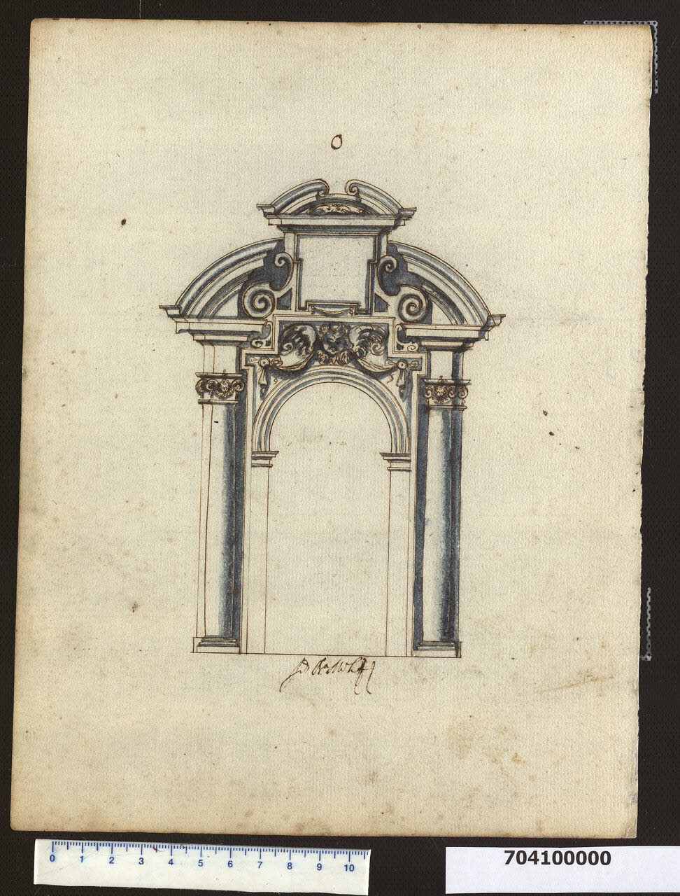 - NOTIZIE STORICO CRITICHE Nell'"Indice" del tomo nel quale era rilegato, il disegno viene definito: "Porta con lo stesso nome".\nIl foglio fa parte della serie di sette disegni di Giovan Battista Mola che riproducono invenzioni di portali (cfr. Milano, Collezione Sardini Martinelli, inv. 7,42; 7,44; 7,45; 7,47; 7,55 bis, tranne il 7,51 che raffigura la facciata di ingresso al giardino di villa Altemps) di Onorio Longhi, la cui paternità è dichiarata dalla sigla "O" apposta in testa al foglio. Longhi aveva diretto l'attività dell'impresa di Giacomo Mola, fratello di Giovan Battista, nel periodo dal 1617 al 1619.\nIl vano della porta ad arco a tutto sesto è delimitato lateralmente da un ordine corinzio, che regge una trabeazione spezzata al centro per contenere il motivo ornamentale con testa di cherubino alato e nastri. Due segmenti di frontone curvilineo inquadrano una cartella a sua volta sormontata da due segmenti di timpano curvilineo. Non è stato possibile identificarne il soggetto.