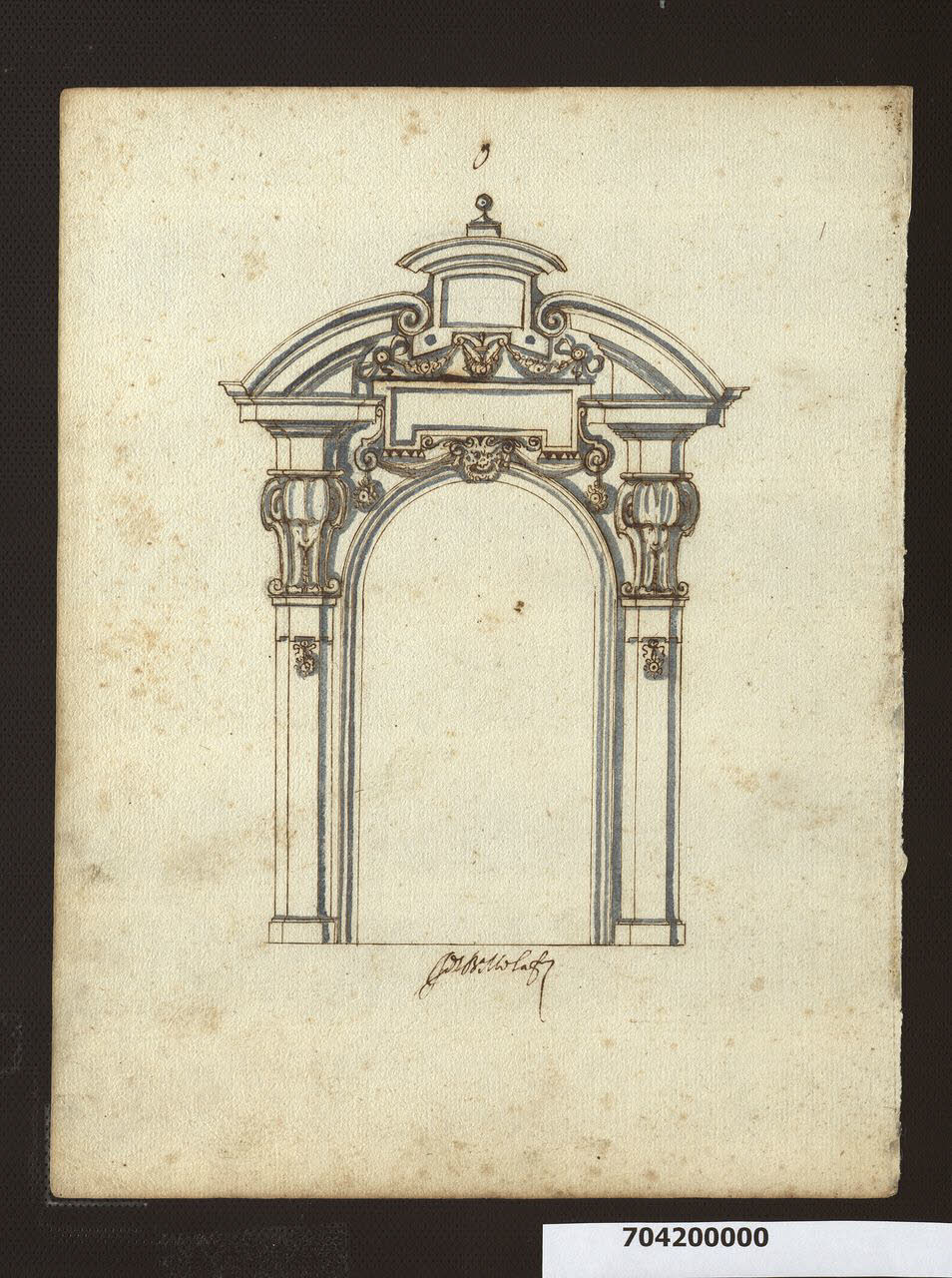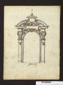 - NOTIZIE STORICO CRITICHE Nell'"Indice" del tomo nel quale era rilegato, il disegno viene definito: "Porta con lo stesso nome".\nIl foglio fa parte della serie di sette disegni di Giovan Battista Mola che riproducono invenzioni di portali (cfr. Milano, Collezione Sardini Martinelli, inv. 7,41; 7,44; 7,45; 7,47; 7,55 bis, tranne il 7,51 che raffigura la facciata di ingresso al giardino di villa Altemps) di Onorio Longhi, la cui paternità è dichiarata dalla sigla "O" apposta in testa al foglio. Longhi aveva diretto l'attività dell'impresa di Giacomo Mola, fratello di Giovan Battista, nel periodo dal 1617 al 1619.\nIl vano della porta ad arco a tutto sesto è inquadrato da lesene ribattute reggenti un capitello/mensola pulvinata. La trabeazione è spezzata al centro per contenere una targa rettangolare sorretta da una maschera corrispondente alla chiave di volta dell'arco. Due segmenti di frontone curvilineo delimitano una cartella a terminazione semicircolare. Non è stato possibile identificarne il soggetto.