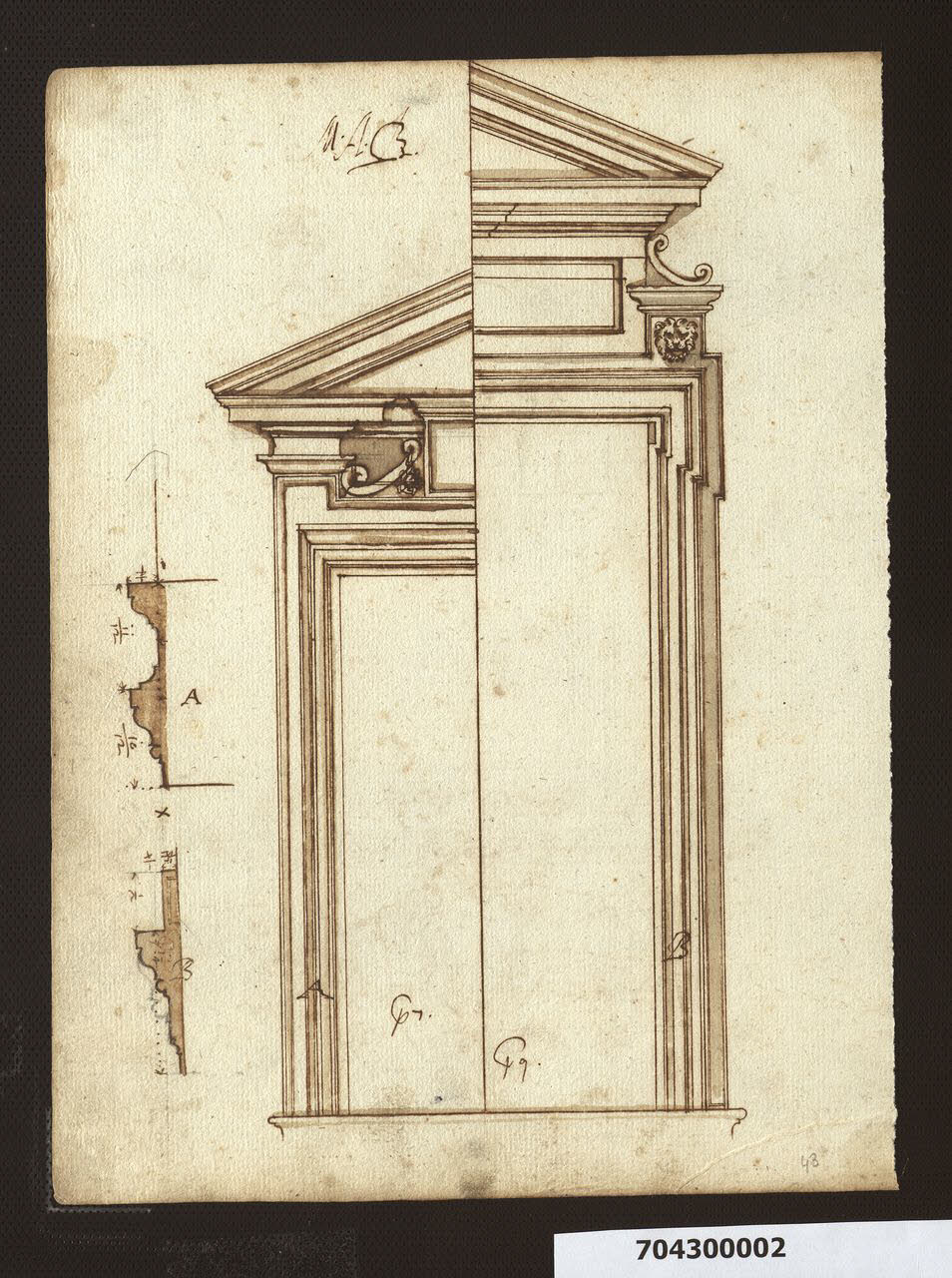 - NOTIZIE STORICO CRITICHE Il foglio fa parte di una serie di porte e finestre disegnate da G. B. Mola e contrassegnate dalle sigle M.A.B., A.B., oppure M.A., relative al periodo del suo studio dedicato alle opere di Michelangelo. Nella parte sinistra del foglio è raffigurata la metà del prospetto di una porta e la pianta della modanatura dello stipite, contrassegnata con la lettera A. Il vano della porta è trabeato con una cornice terminale rialzata a costituire l'elemento di appoggio del timpano triangolare, la cui cornice inferiore è intercettata da una cartella rettangolare fiancheggiata da mensole a "C". Nella parte destra è disegnata un'altra porta trabeata, con una luce più sviluppata in altezza. La cornice superiore presenta delle alette ribattute lateralmente e un rialzo in corrispondenza dello stipite. Tra la cornice superiore e il timpano triangolare è inserita una cartella rettangolare. Entrambe le porte non sono state identificate.
