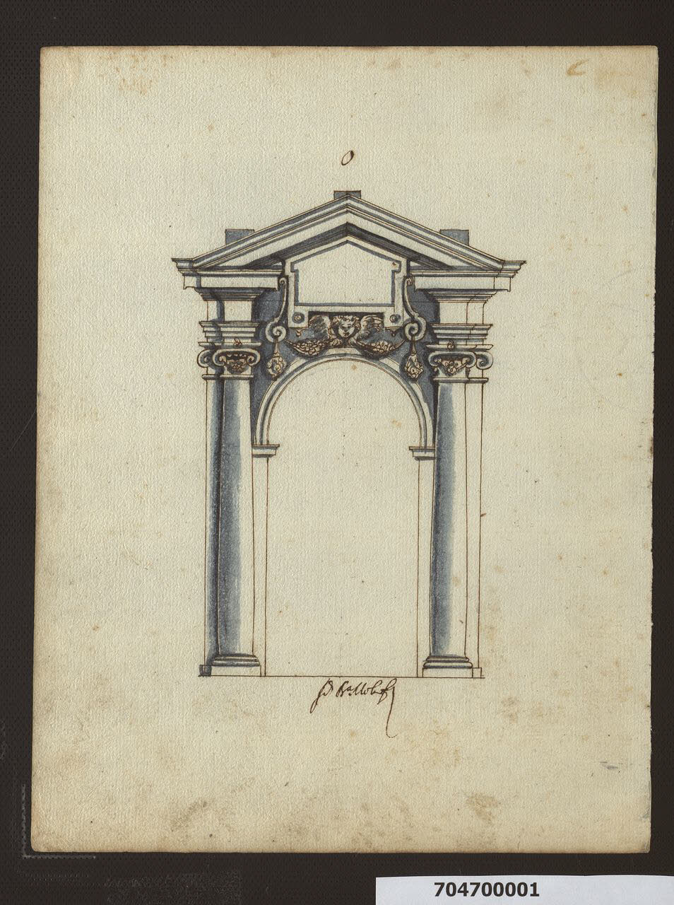 - NOTIZIE STORICO CRITICHE Nell'"Indice" del tomo nel quale era rilegato, il disegno viene definito: "Altre porte con lo stesso nome".\nIl foglio fa parte della serie di sette disegni di Giovan Battista Mola che riproducono invenzioni di portali (cfr. Milano, Collezione Sardini Martinelli, inv. 7,41; 7,42; 7,44; 7,45; 7,55 bis, tranne il 7,51 che raffigura la facciata di ingresso al giardino di villa Altemps) di Onorio Longhi, la cui paternità è dichiarata dalla sigla "O" apposta in testa al foglio. Longhi aveva diretto l'attività dell'impresa di Giacomo Mola, fratello di Giovan Battista, nel periodo dal 1617 al 1619.\nIl disegno raffigura una porta con vano ad arco a tutto sesto inquadrato da un ordine di colonne ioniche ribattute nelle retrostanti lesene. La trabeazione e la cornice inferiore del timpano triangolare sono interrotte per lasciare posto ad una cartella sagomata, sorretta da una testa alata di cherubino che regge ghirlande. Non è stato possibile identificarne il soggetto.