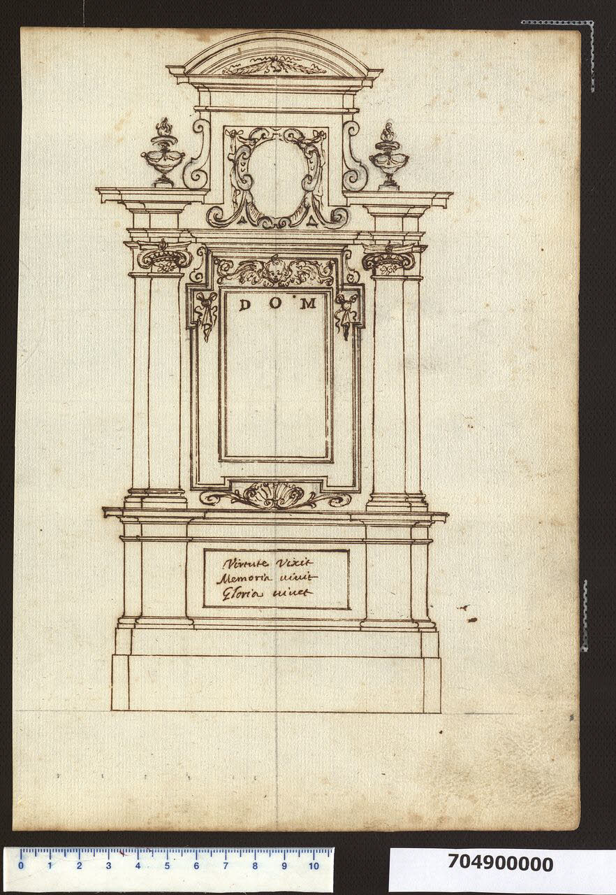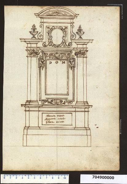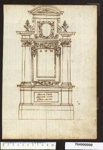 - NOTIZIE STORICO CRITICHE Nell'"Indice" del tomo nel quale era rilegato, il disegno viene definito: "Depositi".\nIl disegno raffigura un monumento che si imposta su un alto basamento ornato al centro da una targa rettangolare con epitaffio. Superiormente lo spazio centrale destinato ad ospitare la pala è delimitato ai lati da colonne/lesene ioniche ribattute che reggono una trabeazione spezzata al centro per l'inserimento di un ovale con cornice mistilinea. Non è stato possibile identificarne il soggetto.