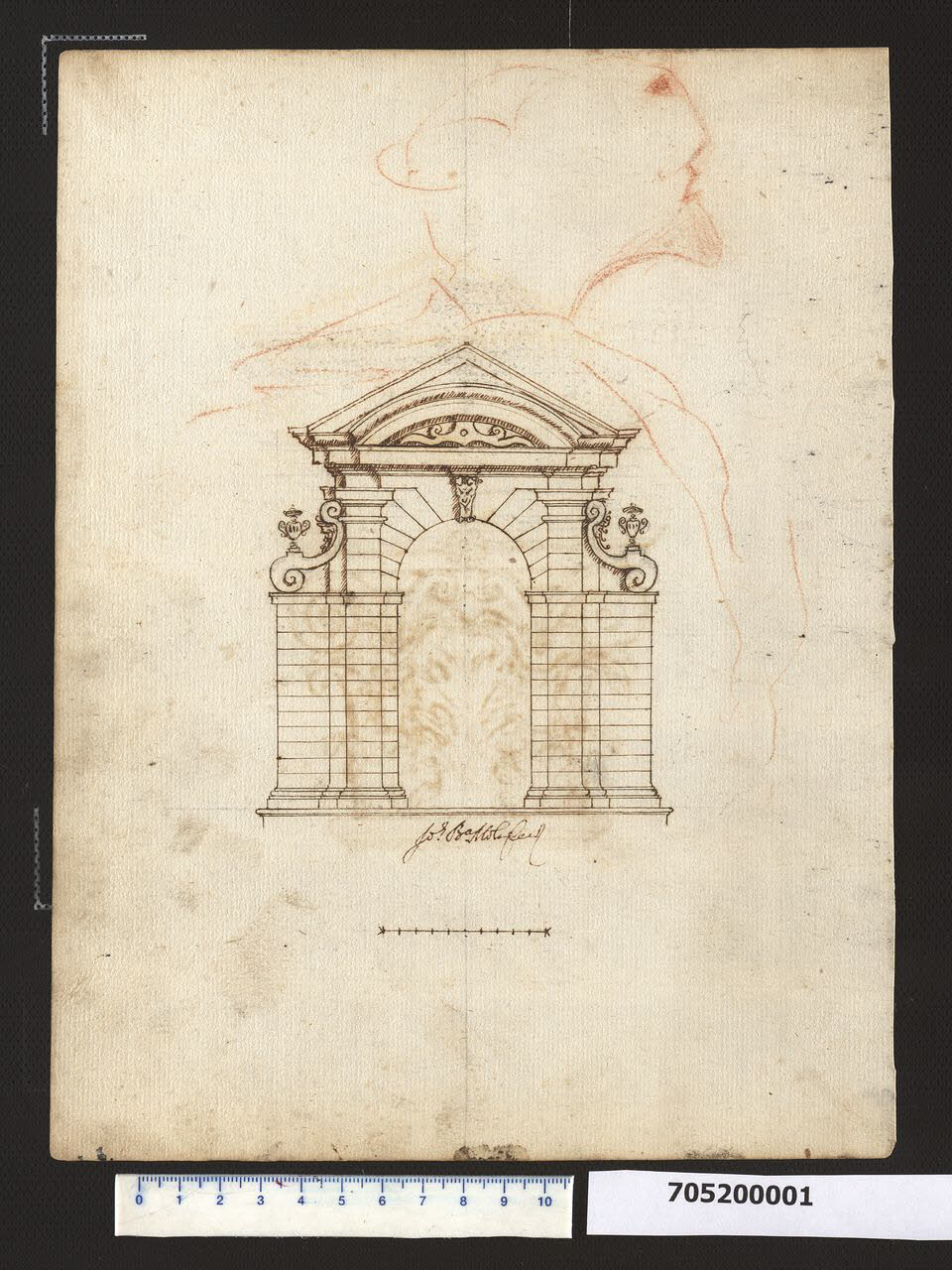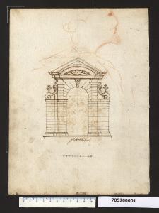 - NOTIZIE STORICO CRITICHE Nell'"Indice" del tomo nel quale era rilegato, il disegno viene definito: "Portone con l'indicato nome".\nIl portale, che non è stato possibile identificare, presenta un vano centrale ad arco a tutto sesto incorniciato da un ordine dorico rustico e fiancheggiato da due setti murari più bassi, raccordati con doppie volute ornate da vasi. La chiave di volta dell'arco, decorata con un mascherone, regge la base del timpano triangolare che ospita all'interno un altro timpano curvilineo.