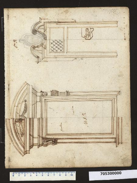 - NOTIZIE STORICO CRITICHE Nell'"Indice" del tomo nel quale era rilegato, il disegno viene definito: "Porta e Finestra".\nSul foglio sono raffigurate nella parte sinistra la metà di due finestre, e nella parte destra una due soluzioni alternative per una medesima porta. Le finestre fanno parte della serie di disegni di G. B. Mola contrassegnati dalle sigle M.A.B., A.B., oppure M.A., relativi al periodo del suo studio dedicato alle opere di Michelangelo, e infatti, la mezza finestra di destra corrisponde a quella del secondo piano del cortile di palazzo Farnese a Roma; mentre quella di destra, che non è stato possibile identificare, potrebbe costituire un'alternativa, con la variante della mensola raddoppiata lateralmente, l'inserimento di un architrave sopra la cornice superiore che porta a uno slittamento verso l'alto di tutta la parte terminale. La porta disegnata a destra, presenta un vano architravato sormontato da una finestra rettangolare munita di grata; gli stipiti sono contornati per metà della loro altezza da un profilo che si conclude alla sommità con due segmenti di timpano curvilineo che reggono una ghirlanda. Al centro della ghirlanda è tracciato a grafite uno scudo. La variante disegnata a destra differisce per una maggiore altezza dello stipite inferiore della finestra e per un minore spessore della cornice superiore spezzata per contenere la ghirlanda. Nel vano a destra è delineata la pianta delle modanature dello stipite.