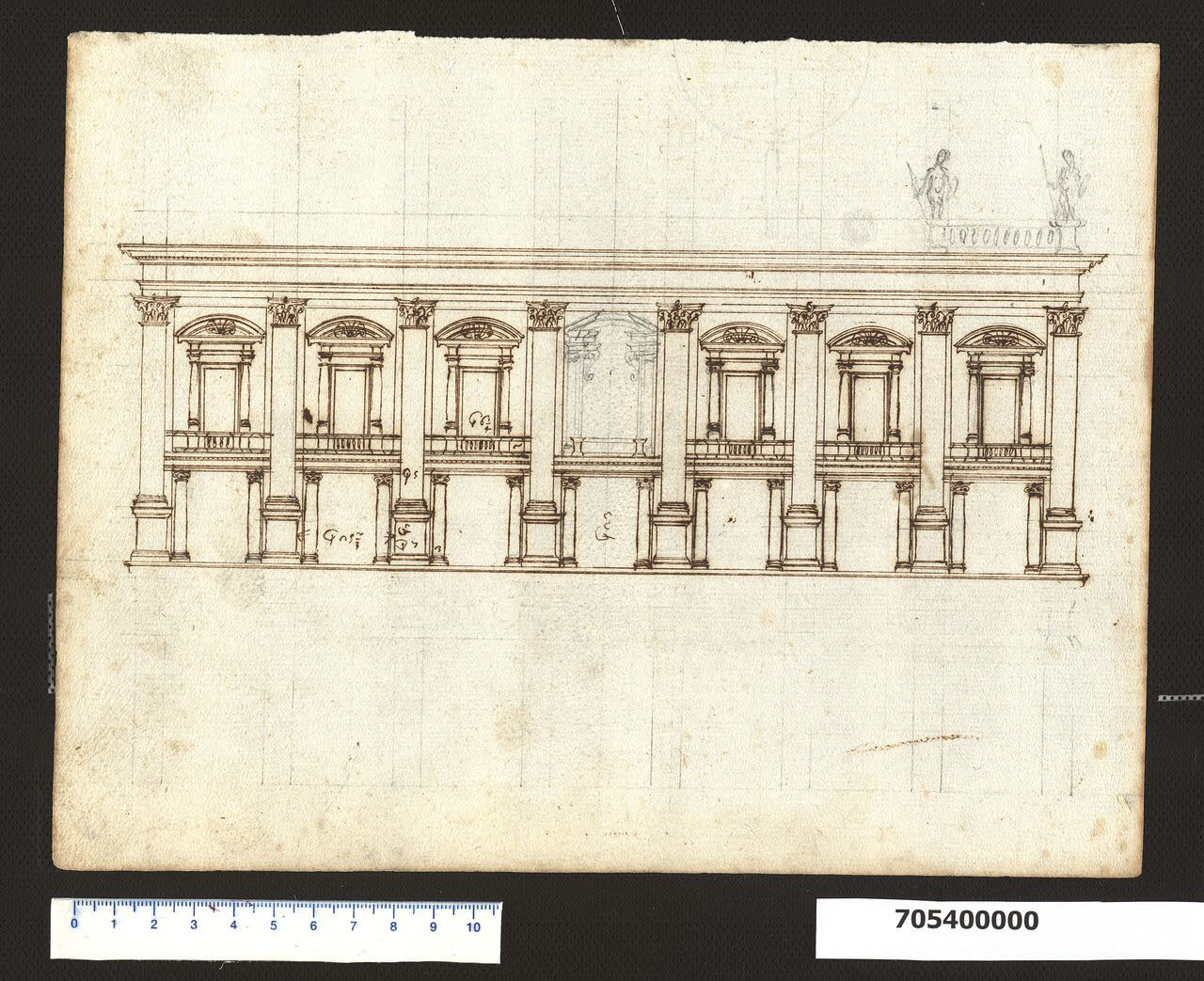 disegno che conserva tracce della preliminare costruzione a grafite; è eseguito principalmente con tiralinee, compasso e a mano libera nelle parti ornamentali; a grafite è tracciata l'articolazione della campata centrale della loggia superiore e la campata terminale destra dell'attico; il supporto sul quale è tracciato è di carta avorio