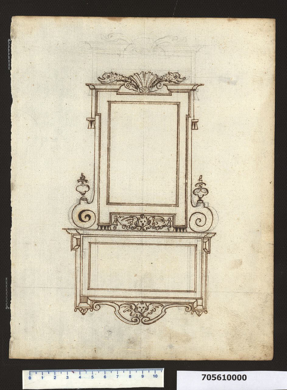 - NOTIZIE STORICO CRITICHE Nell'"Indice" del tomo nel quale era rilegato, il disegno viene definito: "Finestra per il med.o al Colosseo e deposito v. 29".\nLa memoria funebre è composta da una cartella inferiore rettangolare disposta orizzontalmente cui è sovrapposta ortogonalmente un'altra cartella. Quest'ultima presenta una cornice con alette superiori e inferiori rette da gutte ed è ornata alla sommità da una conchiglia rovescia e animali marini.