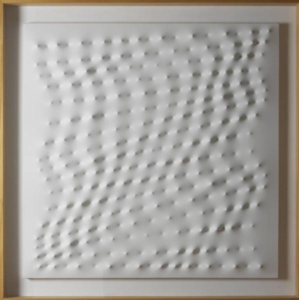 - NOTIZIE STORICO CRITICHE L'opera è stata acquisita con la seconda edizione dell'iniziativa "Città di Lecco per l'arte", frutto di produttiva sinergia tra imprenditoria privata e sensibilità artistica, nata con lo scopo di arricchire i musei cittadini di opere d'arte contemporanea di grande significato (Città Lecco, 1994).\nIl suo autore, Enrico Castellani (classe 1930) è stato uno dei grandi animatori dell'arte italiana degli anni Sessanta del Novecento. Dopo prime esperienze di carattere informale, ispirate all'action painting americano, si accosta allo "Spazialismo" di Lucio Fontana nella ricerca di una terza dimensione della tela. Conosce Agostino Bonalumi e Piero Manzoni col quale fonda la rivista "Azimuth".Dalla collaborazione con Manzoni giunge all'azzeramento totale dell'esperienza artistica precedente, realizzando tele monocrome modulate con varie tecniche, in modo da suscitare tensioni luminose e prospettiche.