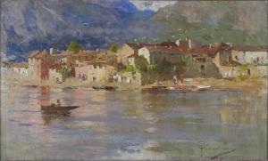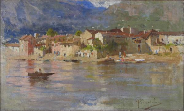 Sono rappresentate le case di Pescarenico affacciate sull'Adda con alcune figure sulla riva ed una barca in primo piano, a sinistra. Il dipinto, protetto da vetro, è appeso entro cornice.