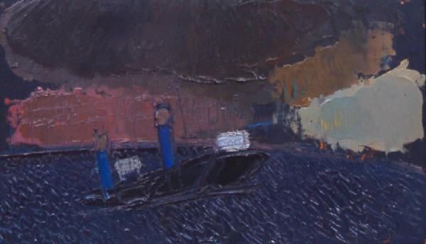 - NOTIZIE STORICO CRITICHE Il dipinto nasce in occasione di un viaggio fra la Corsica e la Sardegna avvenuto nel marzo del 1970. Dagli appunti sul taccuino di schizzi, oltre che dal confronto con altri quadri raffiguranti il medesimo soggetto e quelli di una serie quasi parallela a questa, Bonifacio, si apprende che quella traversata, pur breve, è stata funestata da una tempesta. In questo caso, si tratta di una veduta notturna della zona portuale: nel dipinto prendono gran parte dello spazio la massa marrone-nera del cielo che incombe sulla scena e il cui peso è sottolineato da spesse spatolate discendenti, e la massa sottostante del mare, di un blu cupo e chiuso, movimentata da una fitta rete di incisioni che descrivono un moto ondoso fortemente agitato. Sulla linea dell'orizzonte, realizzati con colori più chiari, ma non propriamente luminosi, poggiano sbilenchi gli edifici del porto. Il centro della scena è dominato dalla figura più dettagliata di una nave in avvicinamento. Questo dipinto arricchisce inoltre la galleria di vedute di città portuali e navi che attraversa nei decenni tutta l'opera di Congdon, da Istanbul, Venezia, Genova e Otranto, passando per la carcassa bruciata dell'Heleanna, le Petroliere sul Niger, appena precedenti questa veduta di Porto Torres, fino all'ultima serie realizzata prima della morte: un relitto abbandonato in secca su una costa venezuelana.