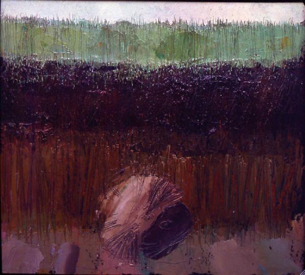 - NOTIZIE STORICO CRITICHE I volatili sono un soggetto ricorrente nella pittura di Congdon e questa serie del Piccione Morto, come già quella dei Guatemala del '57, è simbolicamente connessa ai temi della violenza e della morte. La stessa coincidenza di eventi, che di questi dipinti è stata occasione ispiratrice (l'uccisione di un piccione nell'orto attiguo all'abitazione assisiate di Congdon e il diffondersi della notizia dell'assassinio di Robert Kennedy), è, in tal senso, emblematica.\nCome nelle altre versioni, anche qui la superficie del dipinto è ripartita in tre fasce orizzontali, dai colori straordinariamente caldi e luminosi, tra cui spicca la preziosissima nota verde della fascia superiore. Il dramma si concentra nella massa del piccione, cui il movimento rotatorio conferisce una forma vagamente circolare. Si ha così una singolare contaminazione con il tema del disco - altro motivo forte della pittura congdoniana - qui riproposto nella sua versione dimidiata, con un trascolorare dal bianco al nero. Oltre che dal contrasto cromatico, l'impressione di inaudita violenza è suggerita anche dal movimento convulso delle incisioni.