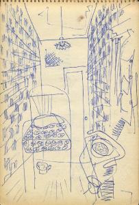 - NOTIZIE STORICO CRITICHE Congdon si è raramente dedicato al disegno come forma espressiva autonoma, così la mole di disegni raccolti sui taccuini non sono altro che appunti visivi presi durante numerosi viaggi. In questo senso non è possibile, se non raramente, assegnare al singolo disegno un'opera finita direttamente corrispondente, così questi disegni non vengono nemmeno ad essere schizzi preparatori. La sommatoria di tutti i disegni relativi a un luogo danno origine a una serie di dipinti che non hanno un corrispettivo oggettivo nei disegni stessi. Tutto questo giustifica la presenza degli appunti all'interno delle immagini (colori, sfumature e spiegazioni di vario genere). Le città marinare sono nei taccuini di Congdon uno dei soggetti più presenti, data la sua abitudine di viaggiare in nave. Qui si sofferma nella descrizione dei posti più significativi da un punto di vista storico artistico ma non disdegna i dettagli quotidiani delle folle dei turisti come dei risvolti più privati che incontra nel suo soggiorno. Conosciamo così i dettagli dell'arredo degli interni (dal bar alla stanza d'albergo). Nei disegni veneziani il tratto si fa particolarmente ricco per arrivare a descrivere tutti gli archi di piazza San Marco, il brulichio delle folle viste dall'alto a passeggio sulle rive del canal grande ecc ecc. fino alle fantasie fiorate dei vestiti delle signore ai tavolini del bar. Le stanze d'albergo, qui come in altri taccuini, non possono non riportare alla memoria gli interni di Matisse, tanto dettagliati nella ricchezza di particolari da diventare un unico lavorio di superficie.