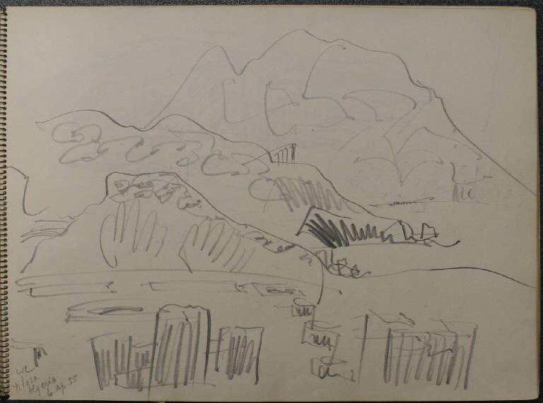- NOTIZIE STORICO CRITICHE Congdon si è raramente dedicato al disegno come forma espressiva autonoma, così la mole di disegni raccolti sui taccuini non sono altro che appunti visivi presi durante numerosi viaggi. In questo senso non è possibile, se non raramente, assegnare al singolo disegno un'opera finita direttamente corrispondente, così questi disegni non vengono nemmeno ad essere schizzi preparatori. La sommatoria di tutti i disegni relativi a un luogo danno origine a una serie di dipinti che non hanno un corrispettivo oggettivo nei disegni stessi. Nel 1955 l'ennesimo viaggio intorno al mondo porta Congdon a visitare Messico, Algeria, Santorini fino all'italiana Positano. \nIn particolare il soggiorno greco origina una serie drammatica di opere, in particolare dovuta al senso tragico insito nello scenario naturale dell'isola. Il vulcano è visibile al centro della laguna come una forma nera emergente dalle acque.